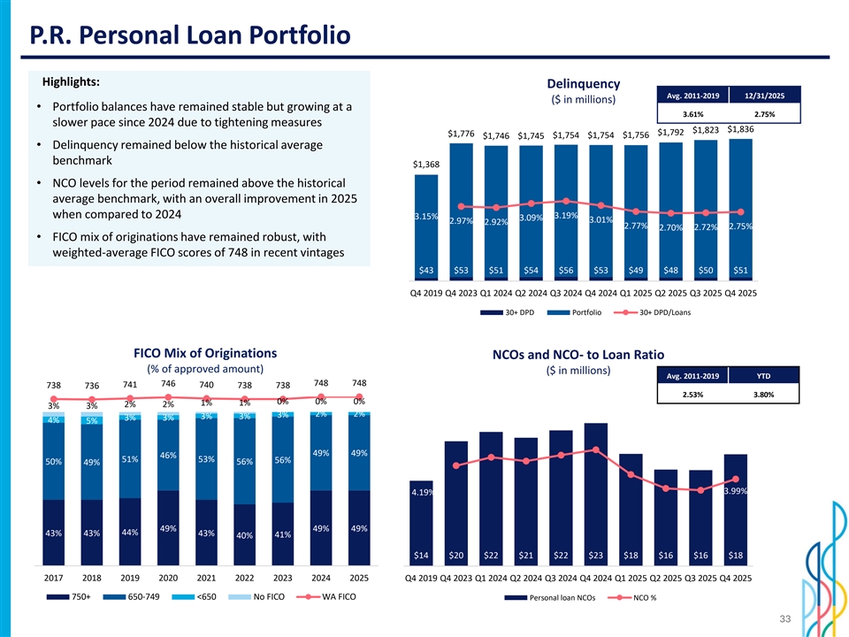 P.R. Personal Loan Portfolio Highlights: Delinquency Avg. 2011-2019 12/31/2025 ($ in millions) • Portfolio balances have remained stable but growing at a 3.61% 2.75% slower pace since 2024 due to tightening measures 200 0 0.06 $1,836 $1,823 $1,792 $1,776 $1,754 $1,754 $1,756 $1,746 $1,745 180 0 • Delinquency remained below the historical average 0.05 160 0 benchmark $1,368 140 0 0.04 • NCO levels for the period remained above the historical 120 0 average benchmark, with an overall improvement in 2025 100 0 0.03 when compared to 2024 3.19% 3.15% 3.09% 800 3.01% 2.97% 2.92% 2.77% 2.75% 2.72% 2.70% 0.02 600 • FICO mix of originations have remained robust, with 400 weighted-average FICO scores of 748 in recent vintages 0.01 200 $43 $53 $51 $54 $56 $53 $49 $48 $50 $51 0 0 Q4 2019 Q4 2023 Q1 2024 Q2 2024 Q3 2024 Q4 2024 Q1 2025 Q2 2025 Q3 2025 Q4 2025 30+ DPD Portfolio 30+ DPD/Loans FICO Mix of Originations NCOs and NCO- to Loan Ratio (% of approved amount) ($ in millions) Avg. 2011-2019 YTD 748 748 746 738 741 740 738 738 736 2.53% 3.80% 0% 0% 0% 1% 1% 2% 2% 700 3% 3% 100% 25 0.07 2% 2% 3% 3% 3% 3% 3% 4% 5% 600 0.06 80% 20 500 49% 49% 0.05 46% 51% 53% 56% 50% 56% 49% 60% 15 400 0.04 3.99% 4.19% 300 0.03 40% 10 200 0.02 49% 49% 49% 20% 44% 43% 43% 43% 5 41% 40% 100 0.01 $14 $20 $22 $21 $22 $23 $18 $16 $16 $18 0% 0 0 0 2017 2018 2019 2020 2021 2022 2023 2024 2025 Q4 2019 Q4 2023 Q1 2024 Q2 2024 Q3 2024 Q4 2024 Q1 2025 Q2 2025 Q3 2025 Q4 2025 750+ 650-749 <650 No FICO WA FICO Personal loan NCOs NCO % 33