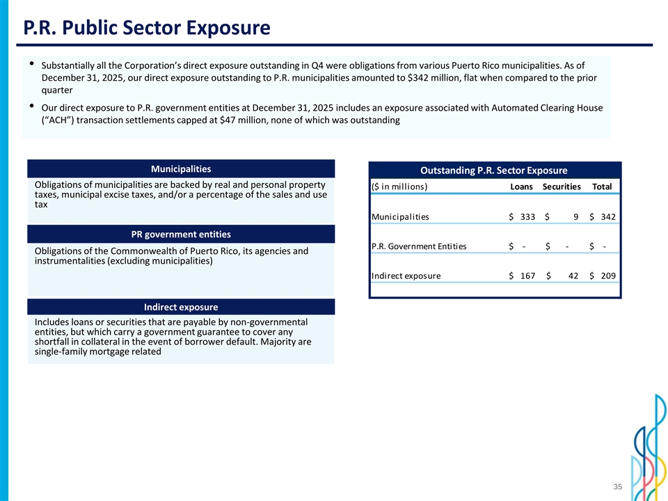 P.R. Public Sector Exposure • Substantially all the Corporation’s direct exposure outstanding in Q4 were obligations from various Puerto Rico municipalities. As of December 31, 2025, our direct exposure outstanding to P.R. municipalities amounted to $342 million, flat when compared to the prior quarter • Our direct exposure to P.R. government entities at December 31, 2025 includes an exposure associated with Automated Clearing House (“ACH”) transaction settlements capped at $47 million, none of which was outstanding Municipalities Outstanding P.R. Sector Exposure Obligations of municipalities are backed by real and personal property ($ in millions) Loans Securities Total taxes, municipal excise taxes, and/or a percentage of the sales and use tax Municipalities $ 333 $ 9 $ 342 PR government entities P.R. Government Entities $ - $ - $ - Obligations of the Commonwealth of Puerto Rico, its agencies and instrumentalities (excluding municipalities) Indirect exposure $ 167 $ 42 $ 209 Indirect exposure Includes loans or securities that are payable by non-governmental entities, but which carry a government guarantee to cover any shortfall in collateral in the event of borrower default. Majority are single-family mortgage related 35
