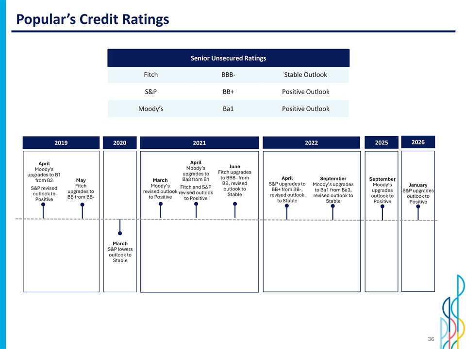 Popular’s Credit Ratings Senior Uns Senior Unsec ecur ured ed Ratings Ratings Fitch BBB- Stable Outlook S&P BB+ Positive Outlook Moody’s Ba1 Positive Outlook 2026 2019 2020 2021 2022 2025 April April June Moody’s Moody's Fitch upgrades upgrades to upgrades to B1 to BBB- from April September Ba3 from B1 September from B2 May March BB, revised S&P upgrades to Moody’s upgrades Moody’s January Fitch Moody’s Fitch and S&P S&P revised outlook to BB+ from BB-, to Ba1 from Ba3, upgrades S&P upgrades upgrades to revised outlook revised outlook outlook to Stable revised outlook revised outlook to outlook to outlook to BB from BB- to Positive to Positive Positive to Stable Stable Positive Positive March S&P lowers outlook to Stable 36