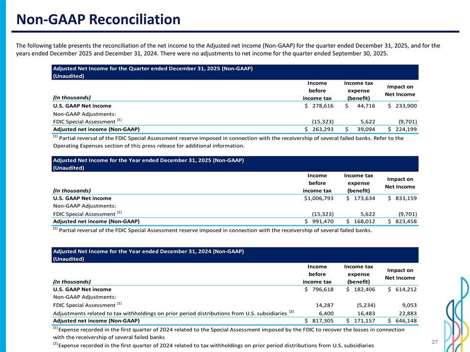Non-GAAP Reconciliation The following table presents the reconciliation of the net income to the Adjusted net income (Non-GAAP) for the quarter ended December 31, 2025, and for the years ended December 2025 and December 31, 2024. There were no adjustments to net income for the quarter ended September 30, 2025. Adjusted Net Income for the Quarter ended December 31, 2025 (Non-GAAP) (Unaudited) Income Income tax Impact on before expense Net Income (In thousands) income tax (benefit) U.S. GAAP Net income $ 278,616 $ 44,716 $ 233,900 Non-GAAP Adjustments: [1] FDIC Special Assessment (15,323) 5,622 (9,701) Adjusted net income (Non-GAAP) $ 263,293 $ 39,094 $ 224,199 [1] Partial reversal of the FDIC Special Assessment reserve imposed in connection with the receivership of several failed banks. Refer to the Operating Expenses section of this press release for additional information. Adjusted Net Income for the Year ended December 31, 2025 (Non-GAAP) (Unaudited) Income Income tax Impact on before expense Net Income (In thousands) income tax (benefit) U.S. GAAP Net income $1,006,793 $ 173,634 $ 833,159 Non-GAAP Adjustments: [1] FDIC Special Assessment (15,323) 5,622 (9,701) Adjusted net income (Non-GAAP) $ 991,470 $ 168,012 $ 823,458 [1] Partial reversal of the FDIC Special Assessment reserve imposed in connection with the receivership of several failed banks. Adjusted Net Income for the Year ended December 31, 2024 (Non-GAAP) (Unaudited) Income Income tax Impact on before expense Net Income (In thousands) income tax (benefit) U.S. GAAP Net income $ 796,618 $ 182,406 $ 614,212 Non-GAAP Adjustments: [1] FDIC Special Assessment 14,287 (5,234) 9,053 [2] Adjustments related to tax withholdings on prior period distributions from U.S. subsidiaries 6,400 16,483 22,883 Adjusted net income (Non-GAAP) $ 817,305 $ 171,157 $ 646,148 [1] Expense recorded in the first quarter of 2024 related to the Special Assessment imposed by the FDIC to recover the losses in connection with the receivership of several failed banks 37 [2] Expense recorded in the first quarter of 2024 related to tax withholdings on prior period distributions from U.S. subsidiaries