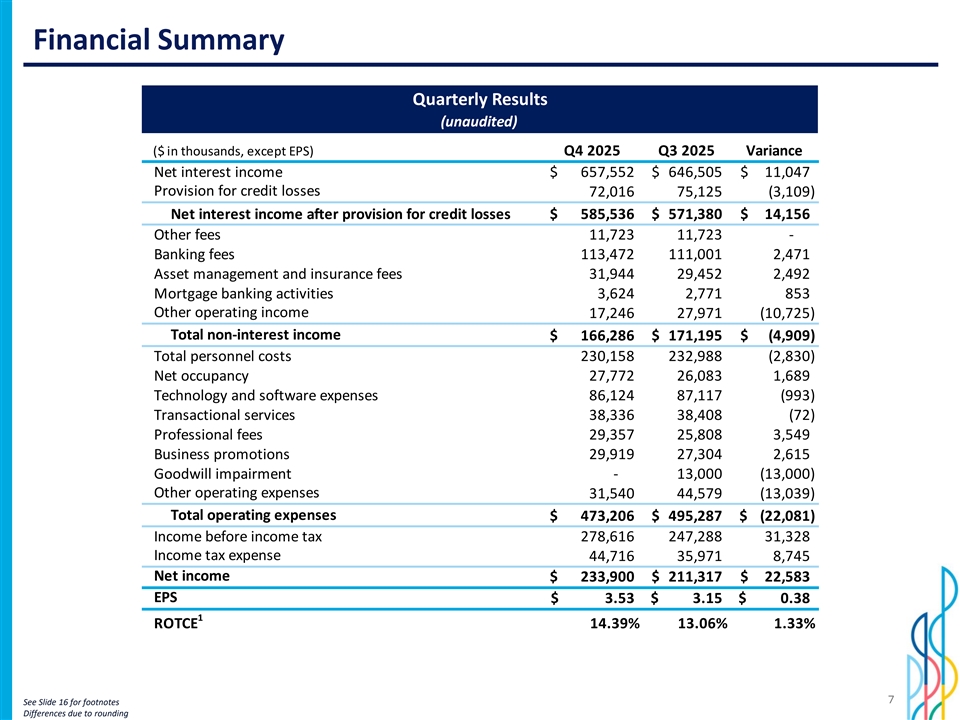 Q4 Business Highlights BPPR Popular U.S. ($ in millions) Q4 2025 Q3 2025 Change Q4 2024 ($ in millions) Q4 2025 Q3 2025 Change Q4 2024 Loans Held in Portfolio $ 27,628 $ 27,131 $ 497 $ 26,147 Loans Held in Portfolio $ 1 1,669 $ 11,525 $ 144 $ 10,929 P.R. Public Deposits 19,414 20,076 ( 662) 19,463 Total Deposits 12,034 12,162 (128) 11,704 Total Deposits 54,741 54,878 ( 137) 54,054 Borrowings 792 582 210 480 Borrowings 62 70 (8) 103 Net Interest Margin 3.11% 2.94% 0.17% 2.71% Net Interest Margin 3.78% 3.71% 0.07% 3.56% Total Deposit Costs 2.85% 2.96% (0.11%) 3.20% Total Deposit Costs 1.42% 1.53% (0.11%) 1.67% Highlights: Highlights: • Loans held in portfolio increased $144 million: • Loans held in portfolio increased $497 million: ‐ commercial and construction loans increased $175 million ‐ commercial and construction loans increased $366 million ‐ mortgage loans decreased $24 million ‐ mortgage loans increased $115 million ‐ mortgage loan originations in Popular U.S. were discontinued at the ‐ credit cards increased $31 million end of Q3 2025 ‐ auto loans and leases decreased $28 million • NIM increased 17 bps to 3.11%: • NIM increased 7 bps to 3.78%: ‐ loan yields increased 12 bps to 6.14% ‐ investment securities yields decreased 4 bps to 2.64% ‐ total deposit costs decreased 11 bps to 2.85% ‐ loan yields decreased 5 bps to 7.74% ‐ total deposit costs decreased 11 bps to 1.42% • Borrowings increased $210 million due to $250 million in short-term FHLB ‐ P.R. public deposit costs decreased 22 bps to 2.97% advances ‐ excluding P.R. public deposits, total deposit costs decreased 1 bp 6 Differences due to rounding