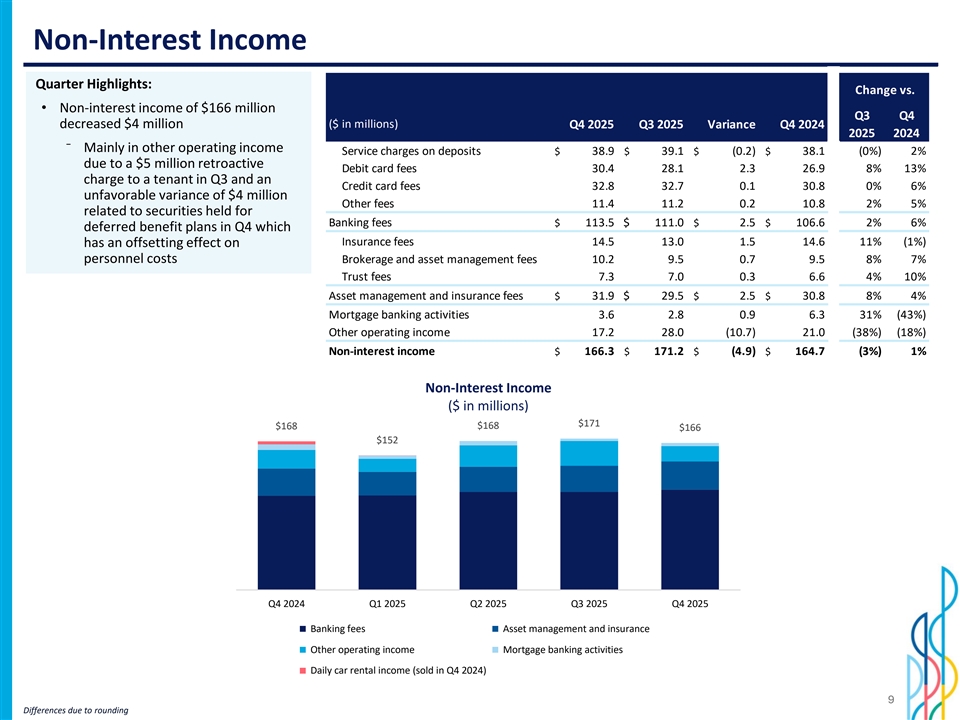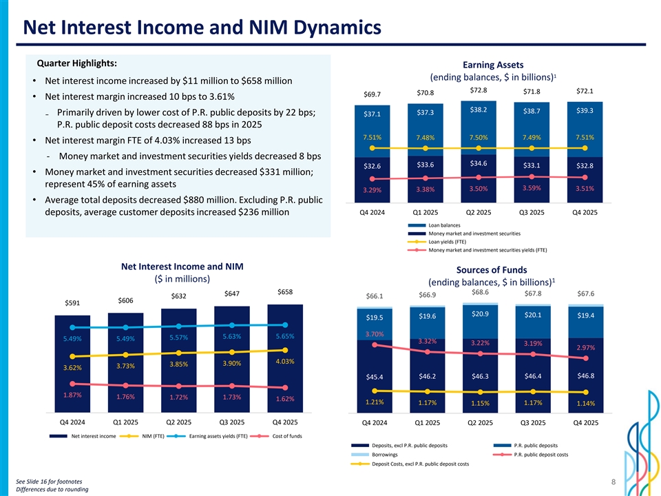 Net Interest Income and NIM Dynamics Quarter Highlights: Earning Assets 1 (ending balances, $ in billions) • Net interest income increased by $11 million to $658 million $72.8 $71.8 $72.1 $70.8 $69.7 • Net interest margin increased 10 bps to 3.61% 0.1 4 70.0 0 $38.2 $39.3 $38.7 $37.3 ₋ Primarily driven by lower cost of P.R. public deposits by 22 bps; 0.1 2 $37.1 60.0 0 P.R. public deposit costs decreased 88 bps in 2025 0.1 50.0 0 7.51% 7.50% 7.49% 7.51% 7.48% • Net interest margin FTE of 4.03% increased 13 bps 0.0 8 40.0 0 ‐ Money market and investment securities yields decreased 8 bps 0.0 6 30.0 0 $34.6 $33.6 $33.1 $32.8 $32.6 0.0 4 • Money market and investment securities decreased $331 million; 20.0 0 represent 45% of earning assets 10.0 0 0.0 2 3.59% 3.50% 3.51% 3.38% 3.29% • Average total deposits decreased $880 million. Excluding P.R. public - 0 deposits, average customer deposits increased $236 million Q4 2024 Q1 2025 Q2 2025 Q3 2025 Q4 2025 Loan balances Money market and investment securities Loan yields (FTE) Money market and investment securities yields (FTE) Net Interest Income and NIM Sources of Funds ($ in millions) 1 (ending balances, $ in billions) $658 $68.6 $647 $67.8 $67.6 $66.9 $632 $66.1 0.06 00 $606 $591 0.0 7 600 $20.9 60.0 0 $20.1 $19.4 $19.6 0.0 6 $19.5 0.05 00 500 50.0 0 0.0 5 3.70% 5.63% 5.65% 5.57% 0.04 00 5.49% 5.49% 3.32% 3.22% 3.19% 400 40.0 0 2.97% 0.0 4 0.03 00 300 4.03% 3.90% 30.0 0 3.85% 0.0 3 3.73% 3.62% 0.02 00 $46.2 $46.3 $46.4 $46.8 $45.4 200 20.0 0 0.0 2 0.01 00 100 1.87% 0.0 1 10.0 0 1.76% 1.72% 1.73% 1.62% 1.21% 1.17% 1.17% 1.15% 1.14% - 0 - - Q4 2024 Q1 2025 Q2 2025 Q3 2025 Q4 2025 Q4 2024 Q1 2025 Q2 2025 Q3 2025 Q4 2025 Net interest income NIM (FTE) Earning assets yields (FTE) Cost of funds Deposits, excl P.R. public deposits P.R. public deposits Borrowings P.R. public deposit costs Deposit Costs, excl P.R. public deposit costs See Slide 16 for footnotes 8 Differences due to rounding