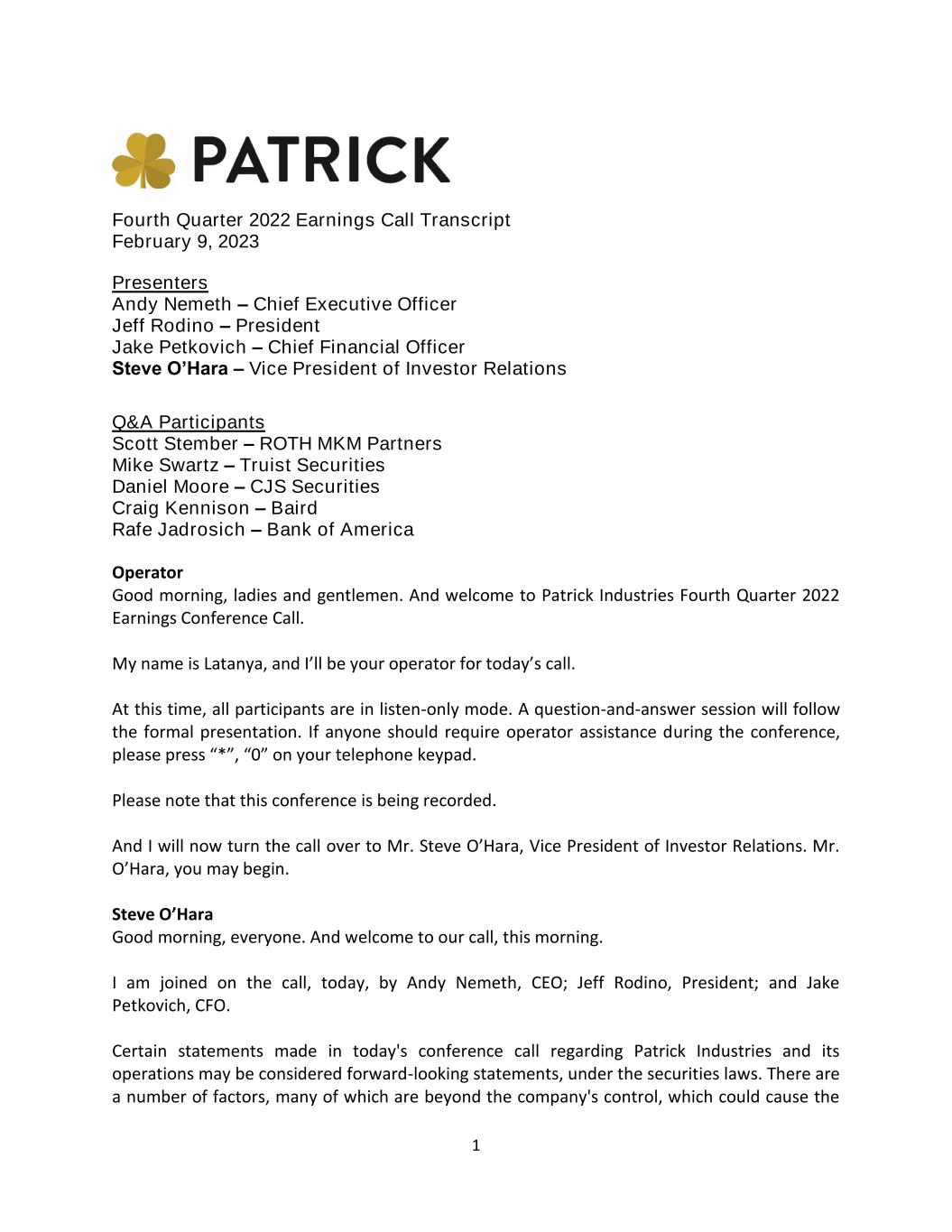 1 Fourth Quarter 2022 Earnings Call Transcript February 9, 2023 Presenters Andy Nemeth – Chief Executive Officer Jeff Rodino – President Jake Petkovich – Chief Financial Officer Steve O’Hara – Vice President of Investor Relations Q&A Participants Scott Stember – ROTH MKM Partners Mike Swartz – Truist Securities Daniel Moore – CJS Securities Craig Kennison – Baird Rafe Jadrosich – Bank of America Operator Good morning, ladies and gentlemen. And welcome to Patrick Industries Fourth Quarter 2022 Earnings Conference Call. My name is Latanya, and I’ll be your operator for today’s call. At this time, all participants are in listen-only mode. A question-and-answer session will follow the formal presentation. If anyone should require operator assistance during the conference, please press “*”, “0” on your telephone keypad. Please note that this conference is being recorded. And I will now turn the call over to Mr. Steve O’Hara, Vice President of Investor Relations. Mr. O’Hara, you may begin. Steve O’Hara Good morning, everyone. And welcome to our call, this morning. I am joined on the call, today, by Andy Nemeth, CEO; Jeff Rodino, President; and Jake Petkovich, CFO. Certain statements made in today's conference call regarding Patrick Industries and its operations may be considered forward-looking statements, under the securities laws. There are a number of factors, many of which are beyond the company's control, which could cause the