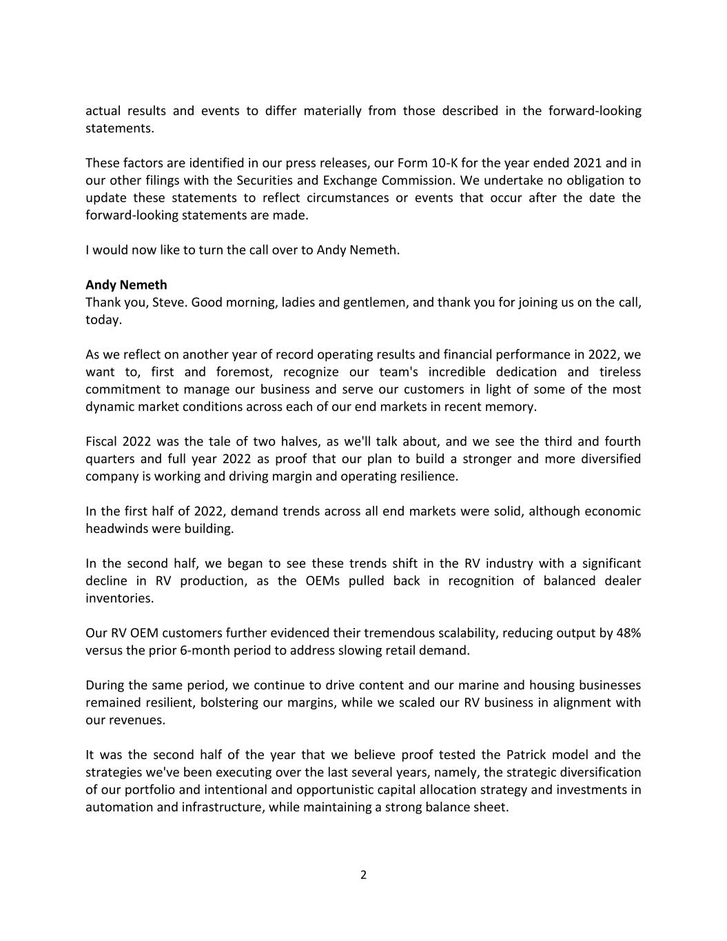 2 actual results and events to differ materially from those described in the forward-looking statements. These factors are identified in our press releases, our Form 10-K for the year ended 2021 and in our other filings with the Securities and Exchange Commission. We undertake no obligation to update these statements to reflect circumstances or events that occur after the date the forward-looking statements are made. I would now like to turn the call over to Andy Nemeth. Andy Nemeth Thank you, Steve. Good morning, ladies and gentlemen, and thank you for joining us on the call, today. As we reflect on another year of record operating results and financial performance in 2022, we want to, first and foremost, recognize our team's incredible dedication and tireless commitment to manage our business and serve our customers in light of some of the most dynamic market conditions across each of our end markets in recent memory. Fiscal 2022 was the tale of two halves, as we'll talk about, and we see the third and fourth quarters and full year 2022 as proof that our plan to build a stronger and more diversified company is working and driving margin and operating resilience. In the first half of 2022, demand trends across all end markets were solid, although economic headwinds were building. In the second half, we began to see these trends shift in the RV industry with a significant decline in RV production, as the OEMs pulled back in recognition of balanced dealer inventories. Our RV OEM customers further evidenced their tremendous scalability, reducing output by 48% versus the prior 6-month period to address slowing retail demand. During the same period, we continue to drive content and our marine and housing businesses remained resilient, bolstering our margins, while we scaled our RV business in alignment with our revenues. It was the second half of the year that we believe proof tested the Patrick model and the strategies we've been executing over the last several years, namely, the strategic diversification of our portfolio and intentional and opportunistic capital allocation strategy and investments in automation and infrastructure, while maintaining a strong balance sheet.