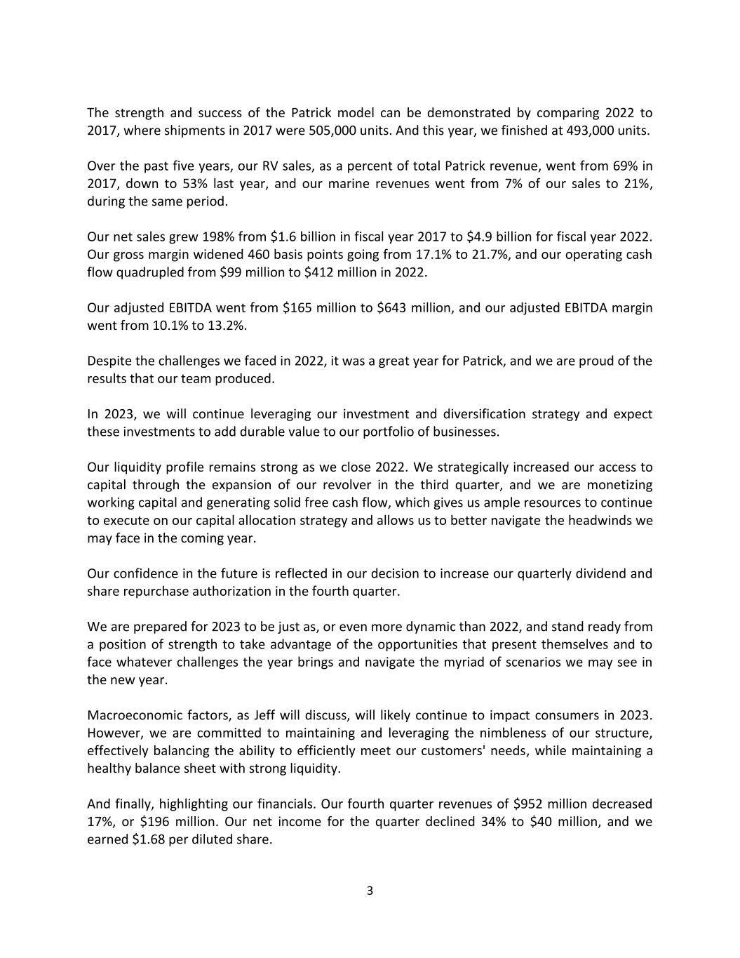 3 The strength and success of the Patrick model can be demonstrated by comparing 2022 to 2017, where shipments in 2017 were 505,000 units. And this year, we finished at 493,000 units. Over the past five years, our RV sales, as a percent of total Patrick revenue, went from 69% in 2017, down to 53% last year, and our marine revenues went from 7% of our sales to 21%, during the same period. Our net sales grew 198% from $1.6 billion in fiscal year 2017 to $4.9 billion for fiscal year 2022. Our gross margin widened 460 basis points going from 17.1% to 21.7%, and our operating cash flow quadrupled from $99 million to $412 million in 2022. Our adjusted EBITDA went from $165 million to $643 million, and our adjusted EBITDA margin went from 10.1% to 13.2%. Despite the challenges we faced in 2022, it was a great year for Patrick, and we are proud of the results that our team produced. In 2023, we will continue leveraging our investment and diversification strategy and expect these investments to add durable value to our portfolio of businesses. Our liquidity profile remains strong as we close 2022. We strategically increased our access to capital through the expansion of our revolver in the third quarter, and we are monetizing working capital and generating solid free cash flow, which gives us ample resources to continue to execute on our capital allocation strategy and allows us to better navigate the headwinds we may face in the coming year. Our confidence in the future is reflected in our decision to increase our quarterly dividend and share repurchase authorization in the fourth quarter. We are prepared for 2023 to be just as, or even more dynamic than 2022, and stand ready from a position of strength to take advantage of the opportunities that present themselves and to face whatever challenges the year brings and navigate the myriad of scenarios we may see in the new year. Macroeconomic factors, as Jeff will discuss, will likely continue to impact consumers in 2023. However, we are committed to maintaining and leveraging the nimbleness of our structure, effectively balancing the ability to efficiently meet our customers' needs, while maintaining a healthy balance sheet with strong liquidity. And finally, highlighting our financials. Our fourth quarter revenues of $952 million decreased 17%, or $196 million. Our net income for the quarter declined 34% to $40 million, and we earned $1.68 per diluted share.