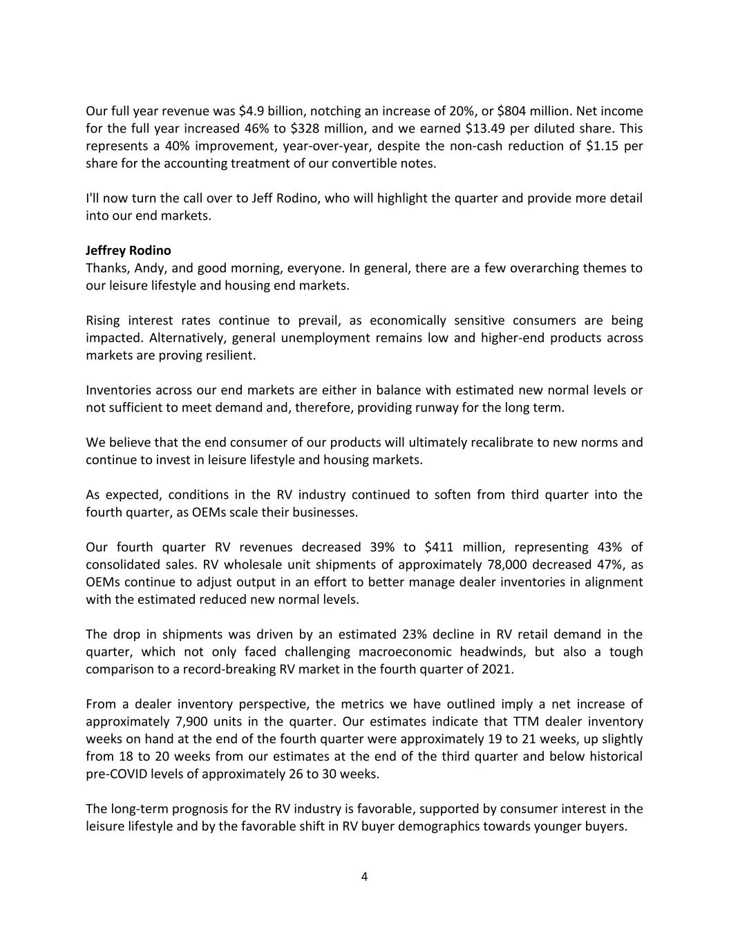 4 Our full year revenue was $4.9 billion, notching an increase of 20%, or $804 million. Net income for the full year increased 46% to $328 million, and we earned $13.49 per diluted share. This represents a 40% improvement, year-over-year, despite the non-cash reduction of $1.15 per share for the accounting treatment of our convertible notes. I'll now turn the call over to Jeff Rodino, who will highlight the quarter and provide more detail into our end markets. Jeffrey Rodino Thanks, Andy, and good morning, everyone. In general, there are a few overarching themes to our leisure lifestyle and housing end markets. Rising interest rates continue to prevail, as economically sensitive consumers are being impacted. Alternatively, general unemployment remains low and higher-end products across markets are proving resilient. Inventories across our end markets are either in balance with estimated new normal levels or not sufficient to meet demand and, therefore, providing runway for the long term. We believe that the end consumer of our products will ultimately recalibrate to new norms and continue to invest in leisure lifestyle and housing markets. As expected, conditions in the RV industry continued to soften from third quarter into the fourth quarter, as OEMs scale their businesses. Our fourth quarter RV revenues decreased 39% to $411 million, representing 43% of consolidated sales. RV wholesale unit shipments of approximately 78,000 decreased 47%, as OEMs continue to adjust output in an effort to better manage dealer inventories in alignment with the estimated reduced new normal levels. The drop in shipments was driven by an estimated 23% decline in RV retail demand in the quarter, which not only faced challenging macroeconomic headwinds, but also a tough comparison to a record-breaking RV market in the fourth quarter of 2021. From a dealer inventory perspective, the metrics we have outlined imply a net increase of approximately 7,900 units in the quarter. Our estimates indicate that TTM dealer inventory weeks on hand at the end of the fourth quarter were approximately 19 to 21 weeks, up slightly from 18 to 20 weeks from our estimates at the end of the third quarter and below historical pre-COVID levels of approximately 26 to 30 weeks. The long-term prognosis for the RV industry is favorable, supported by consumer interest in the leisure lifestyle and by the favorable shift in RV buyer demographics towards younger buyers.