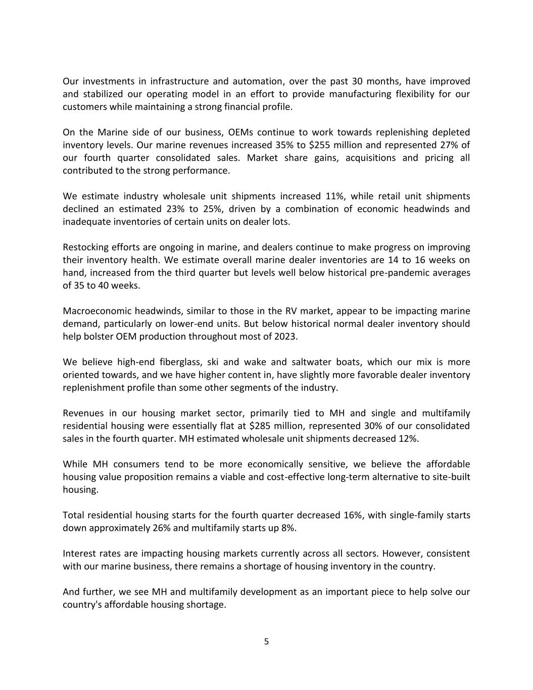 5 Our investments in infrastructure and automation, over the past 30 months, have improved and stabilized our operating model in an effort to provide manufacturing flexibility for our customers while maintaining a strong financial profile. On the Marine side of our business, OEMs continue to work towards replenishing depleted inventory levels. Our marine revenues increased 35% to $255 million and represented 27% of our fourth quarter consolidated sales. Market share gains, acquisitions and pricing all contributed to the strong performance. We estimate industry wholesale unit shipments increased 11%, while retail unit shipments declined an estimated 23% to 25%, driven by a combination of economic headwinds and inadequate inventories of certain units on dealer lots. Restocking efforts are ongoing in marine, and dealers continue to make progress on improving their inventory health. We estimate overall marine dealer inventories are 14 to 16 weeks on hand, increased from the third quarter but levels well below historical pre-pandemic averages of 35 to 40 weeks. Macroeconomic headwinds, similar to those in the RV market, appear to be impacting marine demand, particularly on lower-end units. But below historical normal dealer inventory should help bolster OEM production throughout most of 2023. We believe high-end fiberglass, ski and wake and saltwater boats, which our mix is more oriented towards, and we have higher content in, have slightly more favorable dealer inventory replenishment profile than some other segments of the industry. Revenues in our housing market sector, primarily tied to MH and single and multifamily residential housing were essentially flat at $285 million, represented 30% of our consolidated sales in the fourth quarter. MH estimated wholesale unit shipments decreased 12%. While MH consumers tend to be more economically sensitive, we believe the affordable housing value proposition remains a viable and cost-effective long-term alternative to site-built housing. Total residential housing starts for the fourth quarter decreased 16%, with single-family starts down approximately 26% and multifamily starts up 8%. Interest rates are impacting housing markets currently across all sectors. However, consistent with our marine business, there remains a shortage of housing inventory in the country. And further, we see MH and multifamily development as an important piece to help solve our country's affordable housing shortage.