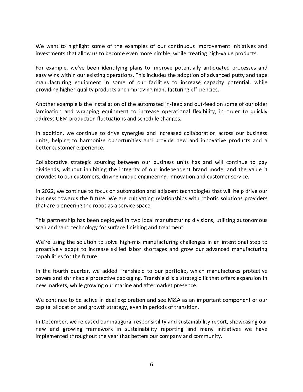 6 We want to highlight some of the examples of our continuous improvement initiatives and investments that allow us to become even more nimble, while creating high-value products. For example, we've been identifying plans to improve potentially antiquated processes and easy wins within our existing operations. This includes the adoption of advanced putty and tape manufacturing equipment in some of our facilities to increase capacity potential, while providing higher-quality products and improving manufacturing efficiencies. Another example is the installation of the automated in-feed and out-feed on some of our older lamination and wrapping equipment to increase operational flexibility, in order to quickly address OEM production fluctuations and schedule changes. In addition, we continue to drive synergies and increased collaboration across our business units, helping to harmonize opportunities and provide new and innovative products and a better customer experience. Collaborative strategic sourcing between our business units has and will continue to pay dividends, without inhibiting the integrity of our independent brand model and the value it provides to our customers, driving unique engineering, innovation and customer service. In 2022, we continue to focus on automation and adjacent technologies that will help drive our business towards the future. We are cultivating relationships with robotic solutions providers that are pioneering the robot as a service space. This partnership has been deployed in two local manufacturing divisions, utilizing autonomous scan and sand technology for surface finishing and treatment. We're using the solution to solve high-mix manufacturing challenges in an intentional step to proactively adapt to increase skilled labor shortages and grow our advanced manufacturing capabilities for the future. In the fourth quarter, we added Transhield to our portfolio, which manufactures protective covers and shrinkable protective packaging. Transhield is a strategic fit that offers expansion in new markets, while growing our marine and aftermarket presence. We continue to be active in deal exploration and see M&A as an important component of our capital allocation and growth strategy, even in periods of transition. In December, we released our inaugural responsibility and sustainability report, showcasing our new and growing framework in sustainability reporting and many initiatives we have implemented throughout the year that betters our company and community.