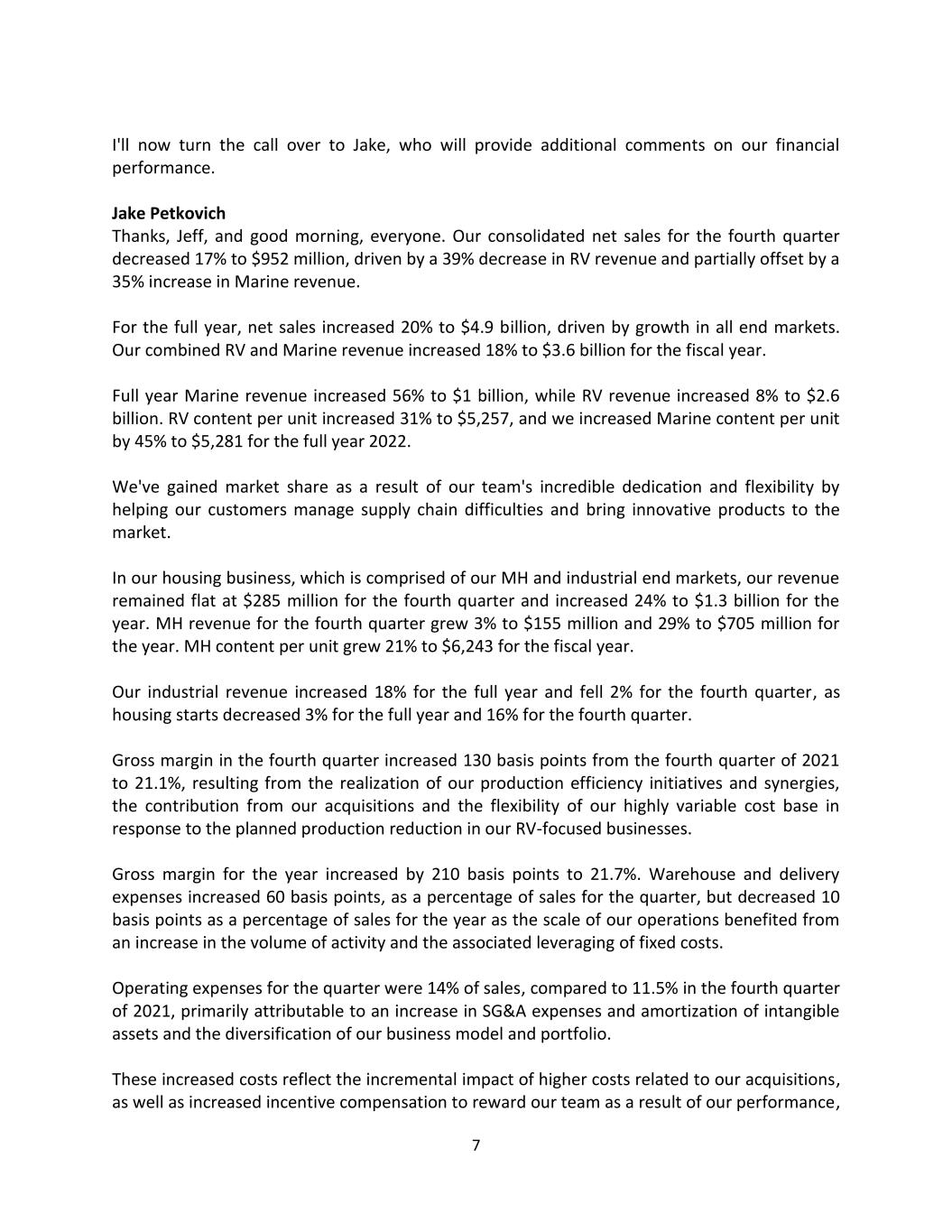 7 I'll now turn the call over to Jake, who will provide additional comments on our financial performance. Jake Petkovich Thanks, Jeff, and good morning, everyone. Our consolidated net sales for the fourth quarter decreased 17% to $952 million, driven by a 39% decrease in RV revenue and partially offset by a 35% increase in Marine revenue. For the full year, net sales increased 20% to $4.9 billion, driven by growth in all end markets. Our combined RV and Marine revenue increased 18% to $3.6 billion for the fiscal year. Full year Marine revenue increased 56% to $1 billion, while RV revenue increased 8% to $2.6 billion. RV content per unit increased 31% to $5,257, and we increased Marine content per unit by 45% to $5,281 for the full year 2022. We've gained market share as a result of our team's incredible dedication and flexibility by helping our customers manage supply chain difficulties and bring innovative products to the market. In our housing business, which is comprised of our MH and industrial end markets, our revenue remained flat at $285 million for the fourth quarter and increased 24% to $1.3 billion for the year. MH revenue for the fourth quarter grew 3% to $155 million and 29% to $705 million for the year. MH content per unit grew 21% to $6,243 for the fiscal year. Our industrial revenue increased 18% for the full year and fell 2% for the fourth quarter, as housing starts decreased 3% for the full year and 16% for the fourth quarter. Gross margin in the fourth quarter increased 130 basis points from the fourth quarter of 2021 to 21.1%, resulting from the realization of our production efficiency initiatives and synergies, the contribution from our acquisitions and the flexibility of our highly variable cost base in response to the planned production reduction in our RV-focused businesses. Gross margin for the year increased by 210 basis points to 21.7%. Warehouse and delivery expenses increased 60 basis points, as a percentage of sales for the quarter, but decreased 10 basis points as a percentage of sales for the year as the scale of our operations benefited from an increase in the volume of activity and the associated leveraging of fixed costs. Operating expenses for the quarter were 14% of sales, compared to 11.5% in the fourth quarter of 2021, primarily attributable to an increase in SG&A expenses and amortization of intangible assets and the diversification of our business model and portfolio. These increased costs reflect the incremental impact of higher costs related to our acquisitions, as well as increased incentive compensation to reward our team as a result of our performance,