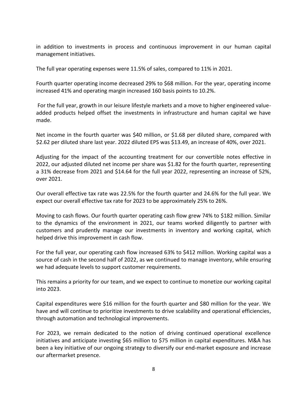 8 in addition to investments in process and continuous improvement in our human capital management initiatives. The full year operating expenses were 11.5% of sales, compared to 11% in 2021. Fourth quarter operating income decreased 29% to $68 million. For the year, operating income increased 41% and operating margin increased 160 basis points to 10.2%. For the full year, growth in our leisure lifestyle markets and a move to higher engineered value- added products helped offset the investments in infrastructure and human capital we have made. Net income in the fourth quarter was $40 million, or $1.68 per diluted share, compared with $2.62 per diluted share last year. 2022 diluted EPS was $13.49, an increase of 40%, over 2021. Adjusting for the impact of the accounting treatment for our convertible notes effective in 2022, our adjusted diluted net income per share was $1.82 for the fourth quarter, representing a 31% decrease from 2021 and $14.64 for the full year 2022, representing an increase of 52%, over 2021. Our overall effective tax rate was 22.5% for the fourth quarter and 24.6% for the full year. We expect our overall effective tax rate for 2023 to be approximately 25% to 26%. Moving to cash flows. Our fourth quarter operating cash flow grew 74% to $182 million. Similar to the dynamics of the environment in 2021, our teams worked diligently to partner with customers and prudently manage our investments in inventory and working capital, which helped drive this improvement in cash flow. For the full year, our operating cash flow increased 63% to $412 million. Working capital was a source of cash in the second half of 2022, as we continued to manage inventory, while ensuring we had adequate levels to support customer requirements. This remains a priority for our team, and we expect to continue to monetize our working capital into 2023. Capital expenditures were $16 million for the fourth quarter and $80 million for the year. We have and will continue to prioritize investments to drive scalability and operational efficiencies, through automation and technological improvements. For 2023, we remain dedicated to the notion of driving continued operational excellence initiatives and anticipate investing $65 million to $75 million in capital expenditures. M&A has been a key initiative of our ongoing strategy to diversify our end-market exposure and increase our aftermarket presence.