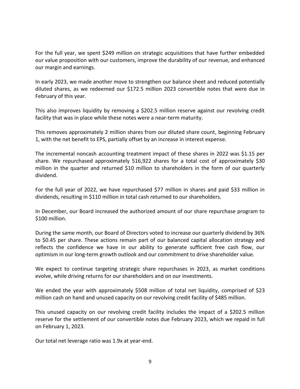 9 For the full year, we spent $249 million on strategic acquisitions that have further embedded our value proposition with our customers, improve the durability of our revenue, and enhanced our margin and earnings. In early 2023, we made another move to strengthen our balance sheet and reduced potentially diluted shares, as we redeemed our $172.5 million 2023 convertible notes that were due in February of this year. This also improves liquidity by removing a $202.5 million reserve against our revolving credit facility that was in place while these notes were a near-term maturity. This removes approximately 2 million shares from our diluted share count, beginning February 1, with the net benefit to EPS, partially offset by an increase in interest expense. The incremental noncash accounting treatment impact of these shares in 2022 was $1.15 per share. We repurchased approximately 516,922 shares for a total cost of approximately $30 million in the quarter and returned $10 million to shareholders in the form of our quarterly dividend. For the full year of 2022, we have repurchased $77 million in shares and paid $33 million in dividends, resulting in $110 million in total cash returned to our shareholders. In December, our Board increased the authorized amount of our share repurchase program to $100 million. During the same month, our Board of Directors voted to increase our quarterly dividend by 36% to $0.45 per share. These actions remain part of our balanced capital allocation strategy and reflects the confidence we have in our ability to generate sufficient free cash flow, our optimism in our long-term growth outlook and our commitment to drive shareholder value. We expect to continue targeting strategic share repurchases in 2023, as market conditions evolve, while driving returns for our shareholders and on our investments. We ended the year with approximately $508 million of total net liquidity, comprised of $23 million cash on hand and unused capacity on our revolving credit facility of $485 million. This unused capacity on our revolving credit facility includes the impact of a $202.5 million reserve for the settlement of our convertible notes due February 2023, which we repaid in full on February 1, 2023. Our total net leverage ratio was 1.9x at year-end.