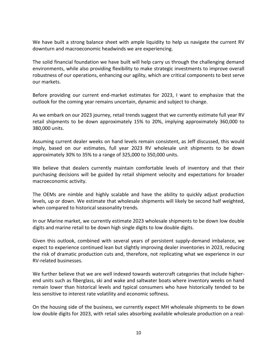 10 We have built a strong balance sheet with ample liquidity to help us navigate the current RV downturn and macroeconomic headwinds we are experiencing. The solid financial foundation we have built will help carry us through the challenging demand environments, while also providing flexibility to make strategic investments to improve overall robustness of our operations, enhancing our agility, which are critical components to best serve our markets. Before providing our current end-market estimates for 2023, I want to emphasize that the outlook for the coming year remains uncertain, dynamic and subject to change. As we embark on our 2023 journey, retail trends suggest that we currently estimate full year RV retail shipments to be down approximately 15% to 20%, implying approximately 360,000 to 380,000 units. Assuming current dealer weeks on hand levels remain consistent, as Jeff discussed, this would imply, based on our estimates, full year 2023 RV wholesale unit shipments to be down approximately 30% to 35% to a range of 325,000 to 350,000 units. We believe that dealers currently maintain comfortable levels of inventory and that their purchasing decisions will be guided by retail shipment velocity and expectations for broader macroeconomic activity. The OEMs are nimble and highly scalable and have the ability to quickly adjust production levels, up or down. We estimate that wholesale shipments will likely be second half weighted, when compared to historical seasonality trends. In our Marine market, we currently estimate 2023 wholesale shipments to be down low double digits and marine retail to be down high single digits to low double digits. Given this outlook, combined with several years of persistent supply-demand imbalance, we expect to experience continued lean but slightly improving dealer inventories in 2023, reducing the risk of dramatic production cuts and, therefore, not replicating what we experience in our RV-related businesses. We further believe that we are well indexed towards watercraft categories that include higher- end units such as fiberglass, ski and wake and saltwater boats where inventory weeks on hand remain lower than historical levels and typical consumers who have historically tended to be less sensitive to interest rate volatility and economic softness. On the housing side of the business, we currently expect MH wholesale shipments to be down low double digits for 2023, with retail sales absorbing available wholesale production on a real-