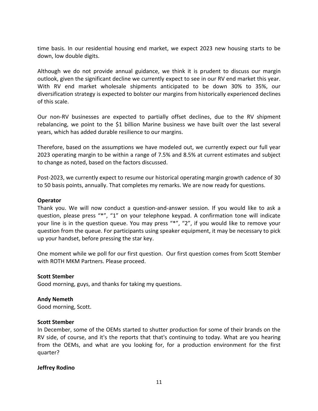 11 time basis. In our residential housing end market, we expect 2023 new housing starts to be down, low double digits. Although we do not provide annual guidance, we think it is prudent to discuss our margin outlook, given the significant decline we currently expect to see in our RV end market this year. With RV end market wholesale shipments anticipated to be down 30% to 35%, our diversification strategy is expected to bolster our margins from historically experienced declines of this scale. Our non-RV businesses are expected to partially offset declines, due to the RV shipment rebalancing, we point to the $1 billion Marine business we have built over the last several years, which has added durable resilience to our margins. Therefore, based on the assumptions we have modeled out, we currently expect our full year 2023 operating margin to be within a range of 7.5% and 8.5% at current estimates and subject to change as noted, based on the factors discussed. Post-2023, we currently expect to resume our historical operating margin growth cadence of 30 to 50 basis points, annually. That completes my remarks. We are now ready for questions. Operator Thank you. We will now conduct a question-and-answer session. If you would like to ask a question, please press “*”, “1” on your telephone keypad. A confirmation tone will indicate your line is in the question queue. You may press “*”, “2”, if you would like to remove your question from the queue. For participants using speaker equipment, it may be necessary to pick up your handset, before pressing the star key. One moment while we poll for our first question. Our first question comes from Scott Stember with ROTH MKM Partners. Please proceed. Scott Stember Good morning, guys, and thanks for taking my questions. Andy Nemeth Good morning, Scott. Scott Stember In December, some of the OEMs started to shutter production for some of their brands on the RV side, of course, and it's the reports that that's continuing to today. What are you hearing from the OEMs, and what are you looking for, for a production environment for the first quarter? Jeffrey Rodino