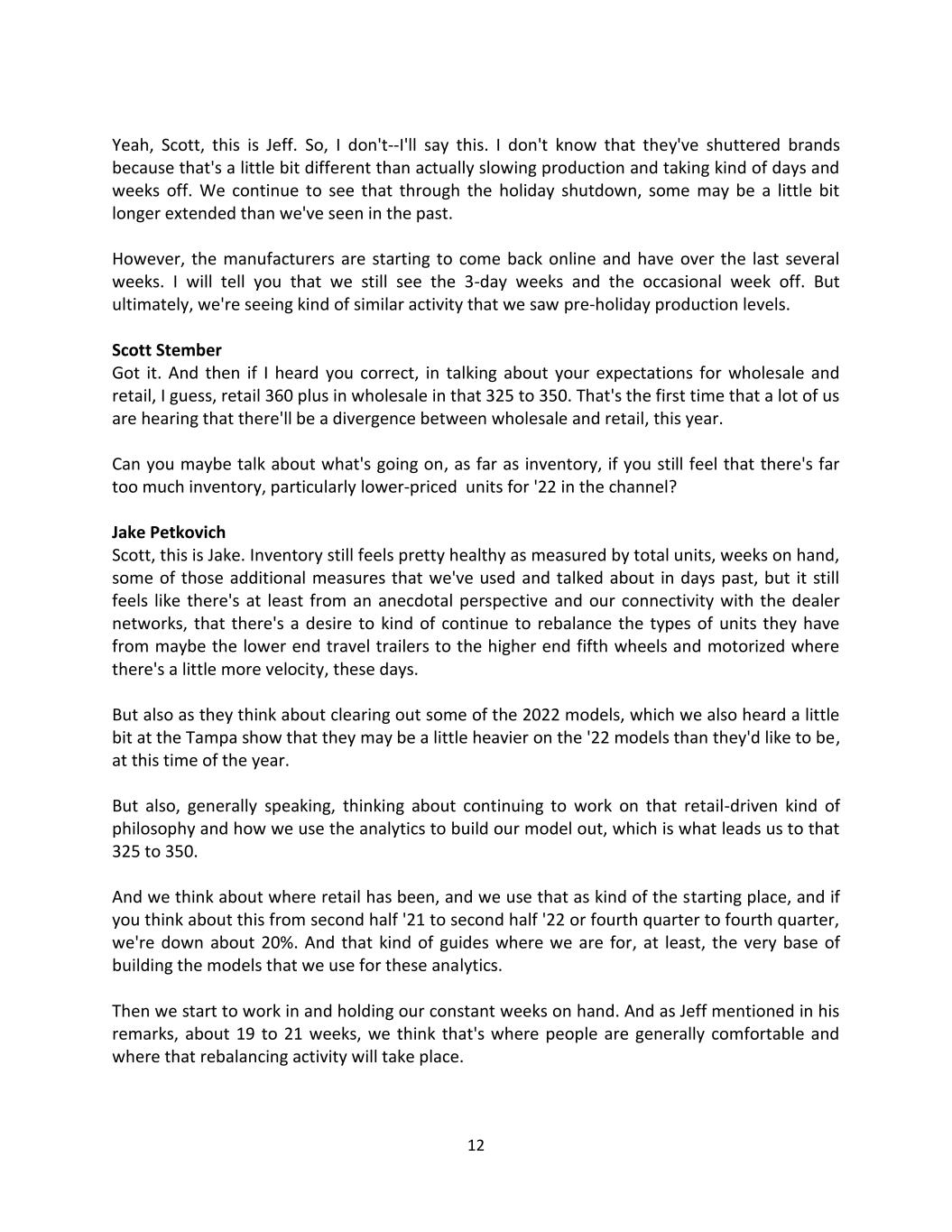 12 Yeah, Scott, this is Jeff. So, I don't--I'll say this. I don't know that they've shuttered brands because that's a little bit different than actually slowing production and taking kind of days and weeks off. We continue to see that through the holiday shutdown, some may be a little bit longer extended than we've seen in the past. However, the manufacturers are starting to come back online and have over the last several weeks. I will tell you that we still see the 3-day weeks and the occasional week off. But ultimately, we're seeing kind of similar activity that we saw pre-holiday production levels. Scott Stember Got it. And then if I heard you correct, in talking about your expectations for wholesale and retail, I guess, retail 360 plus in wholesale in that 325 to 350. That's the first time that a lot of us are hearing that there'll be a divergence between wholesale and retail, this year. Can you maybe talk about what's going on, as far as inventory, if you still feel that there's far too much inventory, particularly lower-priced units for '22 in the channel? Jake Petkovich Scott, this is Jake. Inventory still feels pretty healthy as measured by total units, weeks on hand, some of those additional measures that we've used and talked about in days past, but it still feels like there's at least from an anecdotal perspective and our connectivity with the dealer networks, that there's a desire to kind of continue to rebalance the types of units they have from maybe the lower end travel trailers to the higher end fifth wheels and motorized where there's a little more velocity, these days. But also as they think about clearing out some of the 2022 models, which we also heard a little bit at the Tampa show that they may be a little heavier on the '22 models than they'd like to be, at this time of the year. But also, generally speaking, thinking about continuing to work on that retail-driven kind of philosophy and how we use the analytics to build our model out, which is what leads us to that 325 to 350. And we think about where retail has been, and we use that as kind of the starting place, and if you think about this from second half '21 to second half '22 or fourth quarter to fourth quarter, we're down about 20%. And that kind of guides where we are for, at least, the very base of building the models that we use for these analytics. Then we start to work in and holding our constant weeks on hand. And as Jeff mentioned in his remarks, about 19 to 21 weeks, we think that's where people are generally comfortable and where that rebalancing activity will take place.
