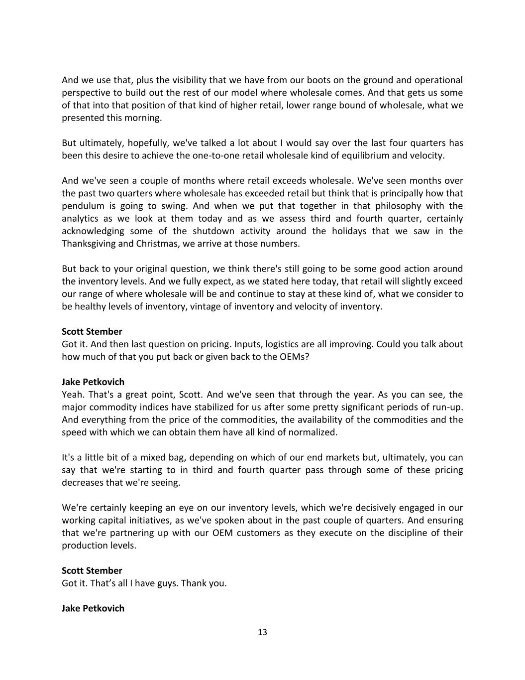 13 And we use that, plus the visibility that we have from our boots on the ground and operational perspective to build out the rest of our model where wholesale comes. And that gets us some of that into that position of that kind of higher retail, lower range bound of wholesale, what we presented this morning. But ultimately, hopefully, we've talked a lot about I would say over the last four quarters has been this desire to achieve the one-to-one retail wholesale kind of equilibrium and velocity. And we've seen a couple of months where retail exceeds wholesale. We've seen months over the past two quarters where wholesale has exceeded retail but think that is principally how that pendulum is going to swing. And when we put that together in that philosophy with the analytics as we look at them today and as we assess third and fourth quarter, certainly acknowledging some of the shutdown activity around the holidays that we saw in the Thanksgiving and Christmas, we arrive at those numbers. But back to your original question, we think there's still going to be some good action around the inventory levels. And we fully expect, as we stated here today, that retail will slightly exceed our range of where wholesale will be and continue to stay at these kind of, what we consider to be healthy levels of inventory, vintage of inventory and velocity of inventory. Scott Stember Got it. And then last question on pricing. Inputs, logistics are all improving. Could you talk about how much of that you put back or given back to the OEMs? Jake Petkovich Yeah. That's a great point, Scott. And we've seen that through the year. As you can see, the major commodity indices have stabilized for us after some pretty significant periods of run-up. And everything from the price of the commodities, the availability of the commodities and the speed with which we can obtain them have all kind of normalized. It's a little bit of a mixed bag, depending on which of our end markets but, ultimately, you can say that we're starting to in third and fourth quarter pass through some of these pricing decreases that we're seeing. We're certainly keeping an eye on our inventory levels, which we're decisively engaged in our working capital initiatives, as we've spoken about in the past couple of quarters. And ensuring that we're partnering up with our OEM customers as they execute on the discipline of their production levels. Scott Stember Got it. That’s all I have guys. Thank you. Jake Petkovich