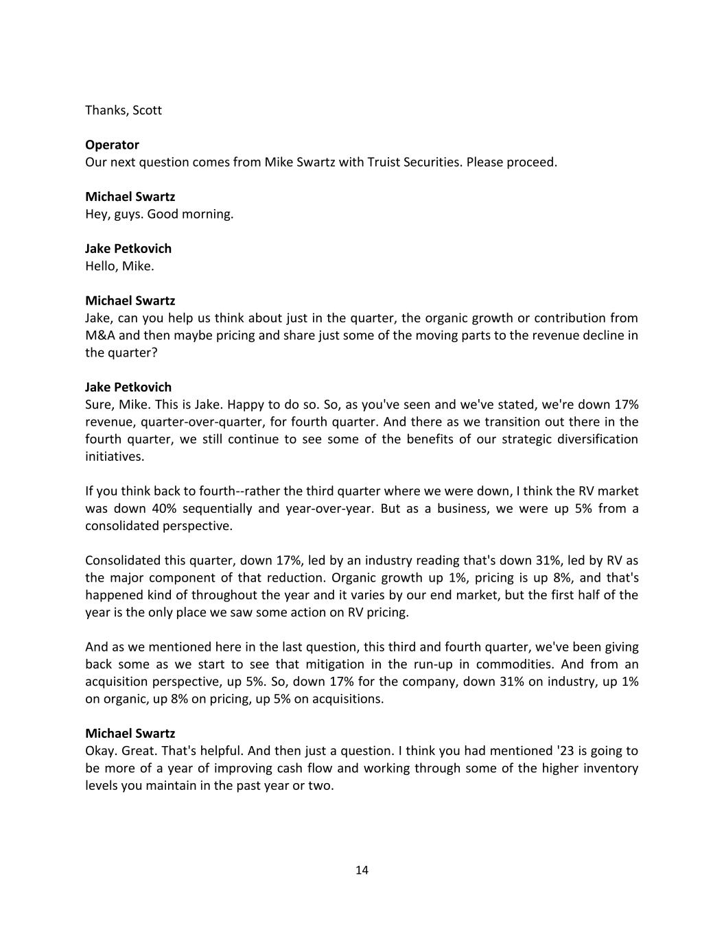 14 Thanks, Scott Operator Our next question comes from Mike Swartz with Truist Securities. Please proceed. Michael Swartz Hey, guys. Good morning. Jake Petkovich Hello, Mike. Michael Swartz Jake, can you help us think about just in the quarter, the organic growth or contribution from M&A and then maybe pricing and share just some of the moving parts to the revenue decline in the quarter? Jake Petkovich Sure, Mike. This is Jake. Happy to do so. So, as you've seen and we've stated, we're down 17% revenue, quarter-over-quarter, for fourth quarter. And there as we transition out there in the fourth quarter, we still continue to see some of the benefits of our strategic diversification initiatives. If you think back to fourth--rather the third quarter where we were down, I think the RV market was down 40% sequentially and year-over-year. But as a business, we were up 5% from a consolidated perspective. Consolidated this quarter, down 17%, led by an industry reading that's down 31%, led by RV as the major component of that reduction. Organic growth up 1%, pricing is up 8%, and that's happened kind of throughout the year and it varies by our end market, but the first half of the year is the only place we saw some action on RV pricing. And as we mentioned here in the last question, this third and fourth quarter, we've been giving back some as we start to see that mitigation in the run-up in commodities. And from an acquisition perspective, up 5%. So, down 17% for the company, down 31% on industry, up 1% on organic, up 8% on pricing, up 5% on acquisitions. Michael Swartz Okay. Great. That's helpful. And then just a question. I think you had mentioned '23 is going to be more of a year of improving cash flow and working through some of the higher inventory levels you maintain in the past year or two.