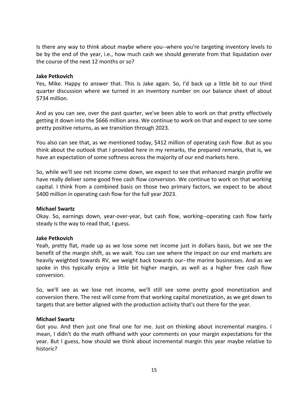 15 Is there any way to think about maybe where you--where you're targeting inventory levels to be by the end of the year, i.e., how much cash we should generate from that liquidation over the course of the next 12 months or so? Jake Petkovich Yes, Mike. Happy to answer that. This is Jake again. So, I'd back up a little bit to our third quarter discussion where we turned in an inventory number on our balance sheet of about $734 million. And as you can see, over the past quarter, we've been able to work on that pretty effectively getting it down into the $666 million area. We continue to work on that and expect to see some pretty positive returns, as we transition through 2023. You also can see that, as we mentioned today, $412 million of operating cash flow .But as you think about the outlook that I provided here in my remarks, the prepared remarks, that is, we have an expectation of some softness across the majority of our end markets here. So, while we'll see net income come down, we expect to see that enhanced margin profile we have really deliver some good free cash flow conversion. We continue to work on that working capital. I think from a combined basis on those two primary factors, we expect to be about $400 million in operating cash flow for the full year 2023. Michael Swartz Okay. So, earnings down, year-over-year, but cash flow, working--operating cash flow fairly steady is the way to read that, I guess. Jake Petkovich Yeah, pretty flat, made up as we lose some net income just in dollars basis, but we see the benefit of the margin shift, as we wait. You can see where the impact on our end markets are heavily weighted towards RV, we weight back towards our--the marine businesses. And as we spoke in this typically enjoy a little bit higher margin, as well as a higher free cash flow conversion. So, we'll see as we lose net income, we'll still see some pretty good monetization and conversion there. The rest will come from that working capital monetization, as we get down to targets that are better aligned with the production activity that's out there for the year. Michael Swartz Got you. And then just one final one for me. Just on thinking about incremental margins. I mean, I didn't do the math offhand with your comments on your margin expectations for the year. But I guess, how should we think about incremental margin this year maybe relative to historic?