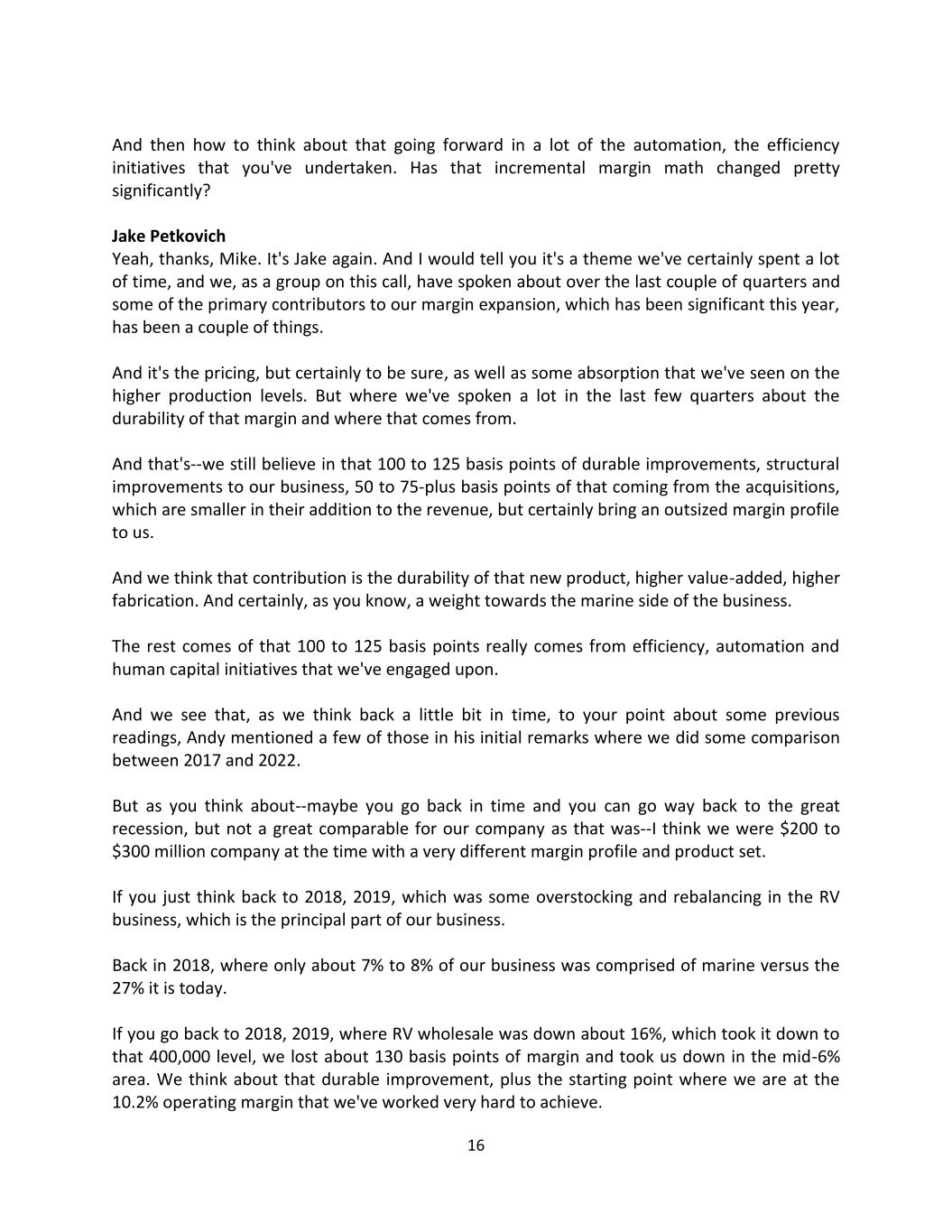 16 And then how to think about that going forward in a lot of the automation, the efficiency initiatives that you've undertaken. Has that incremental margin math changed pretty significantly? Jake Petkovich Yeah, thanks, Mike. It's Jake again. And I would tell you it's a theme we've certainly spent a lot of time, and we, as a group on this call, have spoken about over the last couple of quarters and some of the primary contributors to our margin expansion, which has been significant this year, has been a couple of things. And it's the pricing, but certainly to be sure, as well as some absorption that we've seen on the higher production levels. But where we've spoken a lot in the last few quarters about the durability of that margin and where that comes from. And that's--we still believe in that 100 to 125 basis points of durable improvements, structural improvements to our business, 50 to 75-plus basis points of that coming from the acquisitions, which are smaller in their addition to the revenue, but certainly bring an outsized margin profile to us. And we think that contribution is the durability of that new product, higher value-added, higher fabrication. And certainly, as you know, a weight towards the marine side of the business. The rest comes of that 100 to 125 basis points really comes from efficiency, automation and human capital initiatives that we've engaged upon. And we see that, as we think back a little bit in time, to your point about some previous readings, Andy mentioned a few of those in his initial remarks where we did some comparison between 2017 and 2022. But as you think about--maybe you go back in time and you can go way back to the great recession, but not a great comparable for our company as that was--I think we were $200 to $300 million company at the time with a very different margin profile and product set. If you just think back to 2018, 2019, which was some overstocking and rebalancing in the RV business, which is the principal part of our business. Back in 2018, where only about 7% to 8% of our business was comprised of marine versus the 27% it is today. If you go back to 2018, 2019, where RV wholesale was down about 16%, which took it down to that 400,000 level, we lost about 130 basis points of margin and took us down in the mid-6% area. We think about that durable improvement, plus the starting point where we are at the 10.2% operating margin that we've worked very hard to achieve.