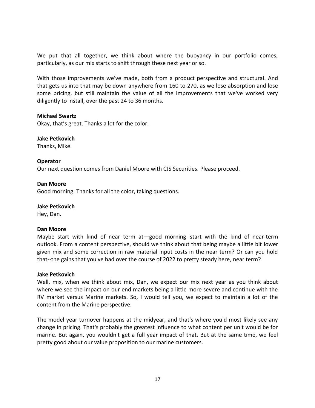 17 We put that all together, we think about where the buoyancy in our portfolio comes, particularly, as our mix starts to shift through these next year or so. With those improvements we've made, both from a product perspective and structural. And that gets us into that may be down anywhere from 160 to 270, as we lose absorption and lose some pricing, but still maintain the value of all the improvements that we've worked very diligently to install, over the past 24 to 36 months. Michael Swartz Okay, that’s great. Thanks a lot for the color. Jake Petkovich Thanks, Mike. Operator Our next question comes from Daniel Moore with CJS Securities. Please proceed. Dan Moore Good morning. Thanks for all the color, taking questions. Jake Petkovich Hey, Dan. Dan Moore Maybe start with kind of near term at—good morning--start with the kind of near-term outlook. From a content perspective, should we think about that being maybe a little bit lower given mix and some correction in raw material input costs in the near term? Or can you hold that--the gains that you've had over the course of 2022 to pretty steady here, near term? Jake Petkovich Well, mix, when we think about mix, Dan, we expect our mix next year as you think about where we see the impact on our end markets being a little more severe and continue with the RV market versus Marine markets. So, I would tell you, we expect to maintain a lot of the content from the Marine perspective. The model year turnover happens at the midyear, and that's where you'd most likely see any change in pricing. That's probably the greatest influence to what content per unit would be for marine. But again, you wouldn't get a full year impact of that. But at the same time, we feel pretty good about our value proposition to our marine customers.