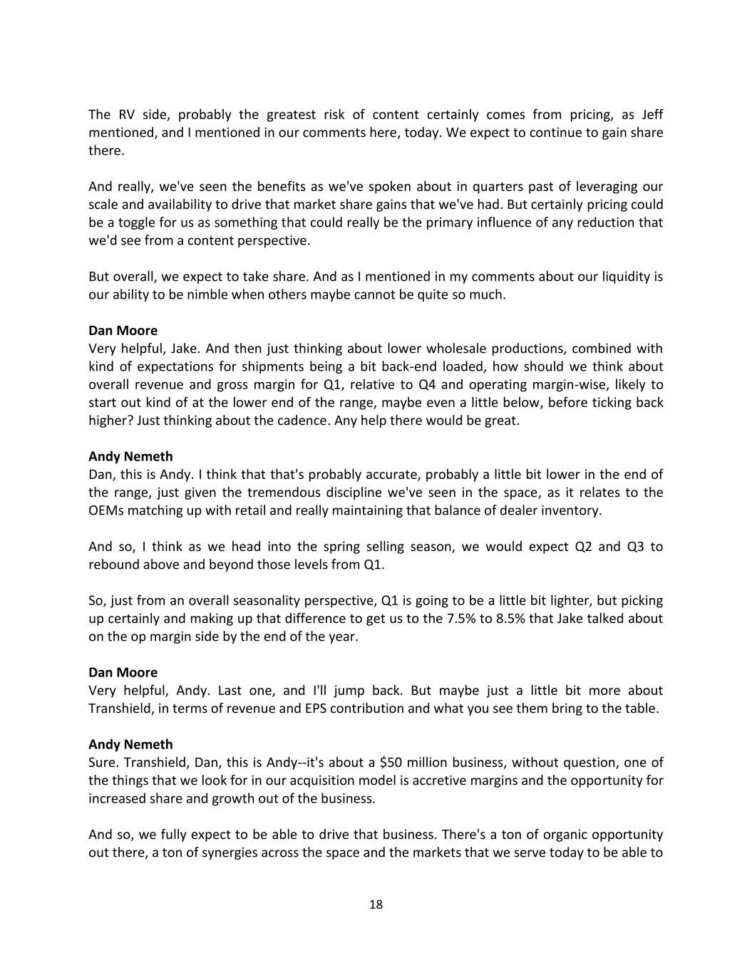 18 The RV side, probably the greatest risk of content certainly comes from pricing, as Jeff mentioned, and I mentioned in our comments here, today. We expect to continue to gain share there. And really, we've seen the benefits as we've spoken about in quarters past of leveraging our scale and availability to drive that market share gains that we've had. But certainly pricing could be a toggle for us as something that could really be the primary influence of any reduction that we'd see from a content perspective. But overall, we expect to take share. And as I mentioned in my comments about our liquidity is our ability to be nimble when others maybe cannot be quite so much. Dan Moore Very helpful, Jake. And then just thinking about lower wholesale productions, combined with kind of expectations for shipments being a bit back-end loaded, how should we think about overall revenue and gross margin for Q1, relative to Q4 and operating margin-wise, likely to start out kind of at the lower end of the range, maybe even a little below, before ticking back higher? Just thinking about the cadence. Any help there would be great. Andy Nemeth Dan, this is Andy. I think that that's probably accurate, probably a little bit lower in the end of the range, just given the tremendous discipline we've seen in the space, as it relates to the OEMs matching up with retail and really maintaining that balance of dealer inventory. And so, I think as we head into the spring selling season, we would expect Q2 and Q3 to rebound above and beyond those levels from Q1. So, just from an overall seasonality perspective, Q1 is going to be a little bit lighter, but picking up certainly and making up that difference to get us to the 7.5% to 8.5% that Jake talked about on the op margin side by the end of the year. Dan Moore Very helpful, Andy. Last one, and I'll jump back. But maybe just a little bit more about Transhield, in terms of revenue and EPS contribution and what you see them bring to the table. Andy Nemeth Sure. Transhield, Dan, this is Andy--it's about a $50 million business, without question, one of the things that we look for in our acquisition model is accretive margins and the opportunity for increased share and growth out of the business. And so, we fully expect to be able to drive that business. There's a ton of organic opportunity out there, a ton of synergies across the space and the markets that we serve today to be able to