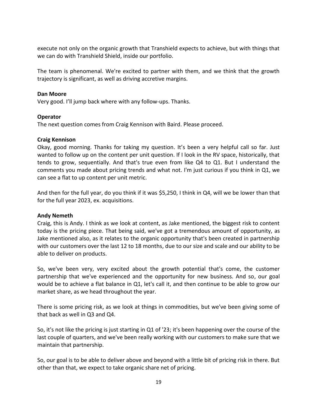 19 execute not only on the organic growth that Transhield expects to achieve, but with things that we can do with Transhield Shield, inside our portfolio. The team is phenomenal. We're excited to partner with them, and we think that the growth trajectory is significant, as well as driving accretive margins. Dan Moore Very good. I’ll jump back where with any follow-ups. Thanks. Operator The next question comes from Craig Kennison with Baird. Please proceed. Craig Kennison Okay, good morning. Thanks for taking my question. It’s been a very helpful call so far. Just wanted to follow up on the content per unit question. If I look in the RV space, historically, that tends to grow, sequentially. And that's true even from like Q4 to Q1. But I understand the comments you made about pricing trends and what not. I'm just curious if you think in Q1, we can see a flat to up content per unit metric. And then for the full year, do you think if it was $5,250, I think in Q4, will we be lower than that for the full year 2023, ex. acquisitions. Andy Nemeth Craig, this is Andy. I think as we look at content, as Jake mentioned, the biggest risk to content today is the pricing piece. That being said, we've got a tremendous amount of opportunity, as Jake mentioned also, as it relates to the organic opportunity that's been created in partnership with our customers over the last 12 to 18 months, due to our size and scale and our ability to be able to deliver on products. So, we've been very, very excited about the growth potential that's come, the customer partnership that we've experienced and the opportunity for new business. And so, our goal would be to achieve a flat balance in Q1, let's call it, and then continue to be able to grow our market share, as we head throughout the year. There is some pricing risk, as we look at things in commodities, but we've been giving some of that back as well in Q3 and Q4. So, it's not like the pricing is just starting in Q1 of '23; it's been happening over the course of the last couple of quarters, and we've been really working with our customers to make sure that we maintain that partnership. So, our goal is to be able to deliver above and beyond with a little bit of pricing risk in there. But other than that, we expect to take organic share net of pricing.