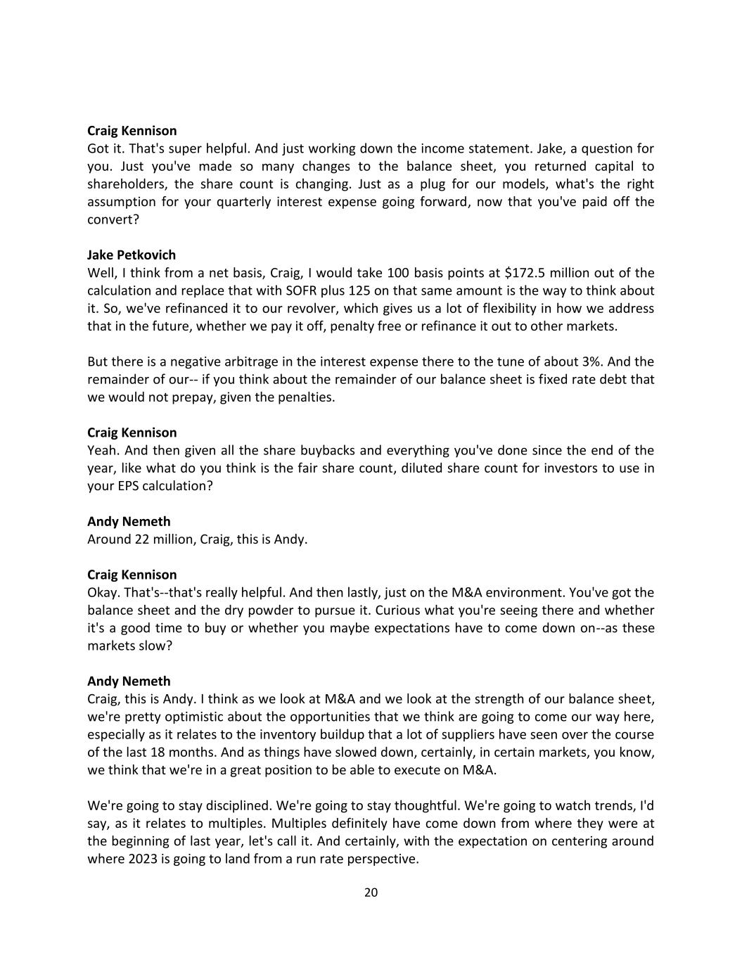 20 Craig Kennison Got it. That's super helpful. And just working down the income statement. Jake, a question for you. Just you've made so many changes to the balance sheet, you returned capital to shareholders, the share count is changing. Just as a plug for our models, what's the right assumption for your quarterly interest expense going forward, now that you've paid off the convert? Jake Petkovich Well, I think from a net basis, Craig, I would take 100 basis points at $172.5 million out of the calculation and replace that with SOFR plus 125 on that same amount is the way to think about it. So, we've refinanced it to our revolver, which gives us a lot of flexibility in how we address that in the future, whether we pay it off, penalty free or refinance it out to other markets. But there is a negative arbitrage in the interest expense there to the tune of about 3%. And the remainder of our-- if you think about the remainder of our balance sheet is fixed rate debt that we would not prepay, given the penalties. Craig Kennison Yeah. And then given all the share buybacks and everything you've done since the end of the year, like what do you think is the fair share count, diluted share count for investors to use in your EPS calculation? Andy Nemeth Around 22 million, Craig, this is Andy. Craig Kennison Okay. That's--that's really helpful. And then lastly, just on the M&A environment. You've got the balance sheet and the dry powder to pursue it. Curious what you're seeing there and whether it's a good time to buy or whether you maybe expectations have to come down on--as these markets slow? Andy Nemeth Craig, this is Andy. I think as we look at M&A and we look at the strength of our balance sheet, we're pretty optimistic about the opportunities that we think are going to come our way here, especially as it relates to the inventory buildup that a lot of suppliers have seen over the course of the last 18 months. And as things have slowed down, certainly, in certain markets, you know, we think that we're in a great position to be able to execute on M&A. We're going to stay disciplined. We're going to stay thoughtful. We're going to watch trends, I'd say, as it relates to multiples. Multiples definitely have come down from where they were at the beginning of last year, let's call it. And certainly, with the expectation on centering around where 2023 is going to land from a run rate perspective.