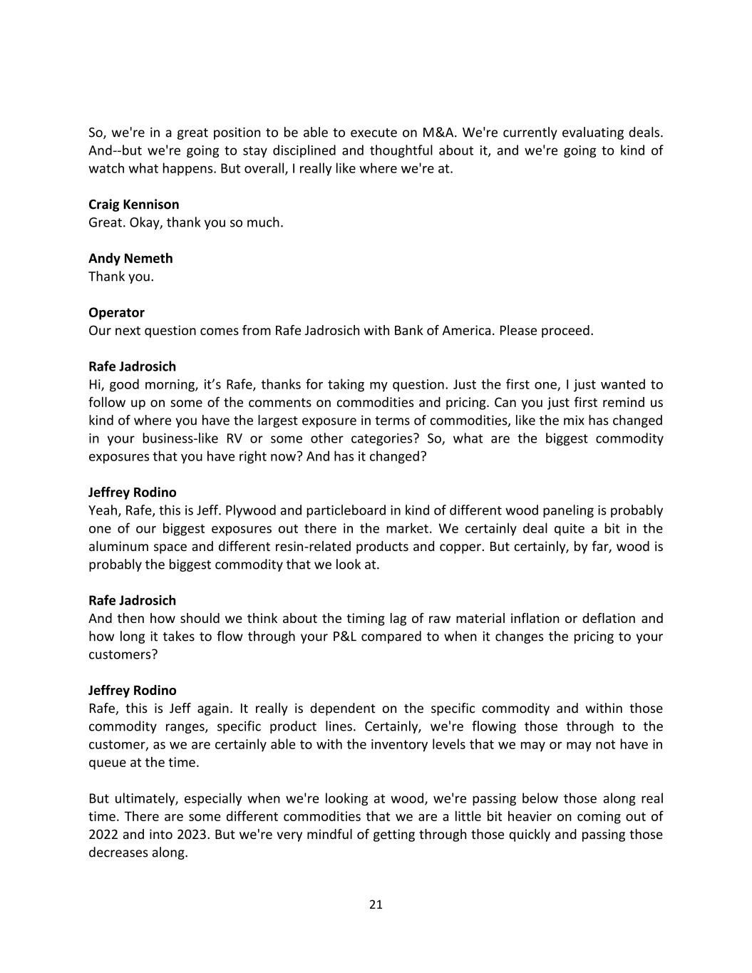 21 So, we're in a great position to be able to execute on M&A. We're currently evaluating deals. And--but we're going to stay disciplined and thoughtful about it, and we're going to kind of watch what happens. But overall, I really like where we're at. Craig Kennison Great. Okay, thank you so much. Andy Nemeth Thank you. Operator Our next question comes from Rafe Jadrosich with Bank of America. Please proceed. Rafe Jadrosich Hi, good morning, it’s Rafe, thanks for taking my question. Just the first one, I just wanted to follow up on some of the comments on commodities and pricing. Can you just first remind us kind of where you have the largest exposure in terms of commodities, like the mix has changed in your business-like RV or some other categories? So, what are the biggest commodity exposures that you have right now? And has it changed? Jeffrey Rodino Yeah, Rafe, this is Jeff. Plywood and particleboard in kind of different wood paneling is probably one of our biggest exposures out there in the market. We certainly deal quite a bit in the aluminum space and different resin-related products and copper. But certainly, by far, wood is probably the biggest commodity that we look at. Rafe Jadrosich And then how should we think about the timing lag of raw material inflation or deflation and how long it takes to flow through your P&L compared to when it changes the pricing to your customers? Jeffrey Rodino Rafe, this is Jeff again. It really is dependent on the specific commodity and within those commodity ranges, specific product lines. Certainly, we're flowing those through to the customer, as we are certainly able to with the inventory levels that we may or may not have in queue at the time. But ultimately, especially when we're looking at wood, we're passing below those along real time. There are some different commodities that we are a little bit heavier on coming out of 2022 and into 2023. But we're very mindful of getting through those quickly and passing those decreases along.