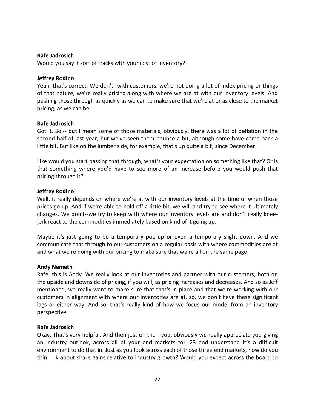 22 Rafe Jadrosich Would you say it sort of tracks with your cost of inventory? Jeffrey Rodino Yeah, that's correct. We don't--with customers, we're not doing a lot of index pricing or things of that nature, we're really pricing along with where we are at with our inventory levels. And pushing those through as quickly as we can to make sure that we're at or as close to the market pricing, as we can be. Rafe Jadrosich Got it. So,-- but I mean some of those materials, obviously, there was a lot of deflation in the second half of last year, but we've seen them bounce a bit, although some have come back a little bit. But like on the lumber side, for example, that's up quite a bit, since December. Like would you start passing that through, what's your expectation on something like that? Or is that something where you’d have to see more of an increase before you would push that pricing through it? Jeffrey Rodino Well, it really depends on where we're at with our inventory levels at the time of when those prices go up. And if we're able to hold off a little bit, we will and try to see where it ultimately changes. We don't--we try to keep with where our inventory levels are and don't really knee- jerk react to the commodities immediately based on kind of it going up. Maybe it's just going to be a temporary pop-up or even a temporary slight down. And we communicate that through to our customers on a regular basis with where commodities are at and what we're doing with our pricing to make sure that we're all on the same page. Andy Nemeth Rafe, this is Andy. We really look at our inventories and partner with our customers, both on the upside and downside of pricing, if you will, as pricing increases and decreases. And so as Jeff mentioned, we really want to make sure that that's in place and that we're working with our customers in alignment with where our inventories are at, so, we don't have these significant lags or either way. And so, that's really kind of how we focus our model from an inventory perspective. Rafe Jadrosich Okay. That's very helpful. And then just on the—you, obviously we really appreciate you giving an industry outlook, across all of your end markets for '23 and understand it’s a difficult environment to do that in. Just as you look across each of those three end markets, how do you thin k about share gains relative to industry growth? Would you expect across the board to