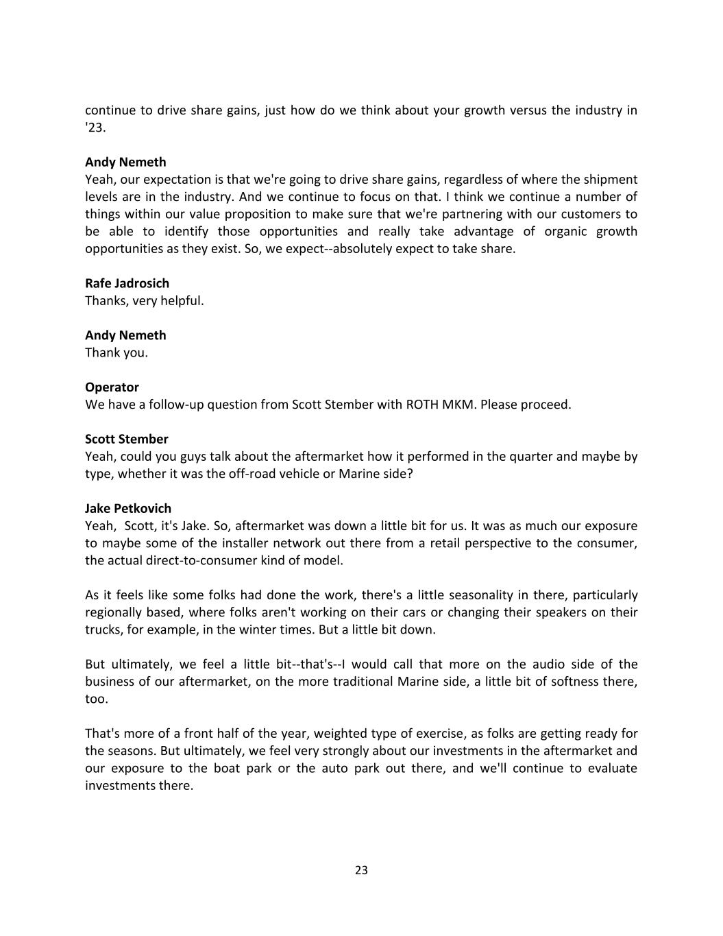 23 continue to drive share gains, just how do we think about your growth versus the industry in '23. Andy Nemeth Yeah, our expectation is that we're going to drive share gains, regardless of where the shipment levels are in the industry. And we continue to focus on that. I think we continue a number of things within our value proposition to make sure that we're partnering with our customers to be able to identify those opportunities and really take advantage of organic growth opportunities as they exist. So, we expect--absolutely expect to take share. Rafe Jadrosich Thanks, very helpful. Andy Nemeth Thank you. Operator We have a follow-up question from Scott Stember with ROTH MKM. Please proceed. Scott Stember Yeah, could you guys talk about the aftermarket how it performed in the quarter and maybe by type, whether it was the off-road vehicle or Marine side? Jake Petkovich Yeah, Scott, it's Jake. So, aftermarket was down a little bit for us. It was as much our exposure to maybe some of the installer network out there from a retail perspective to the consumer, the actual direct-to-consumer kind of model. As it feels like some folks had done the work, there's a little seasonality in there, particularly regionally based, where folks aren't working on their cars or changing their speakers on their trucks, for example, in the winter times. But a little bit down. But ultimately, we feel a little bit--that's--I would call that more on the audio side of the business of our aftermarket, on the more traditional Marine side, a little bit of softness there, too. That's more of a front half of the year, weighted type of exercise, as folks are getting ready for the seasons. But ultimately, we feel very strongly about our investments in the aftermarket and our exposure to the boat park or the auto park out there, and we'll continue to evaluate investments there.
