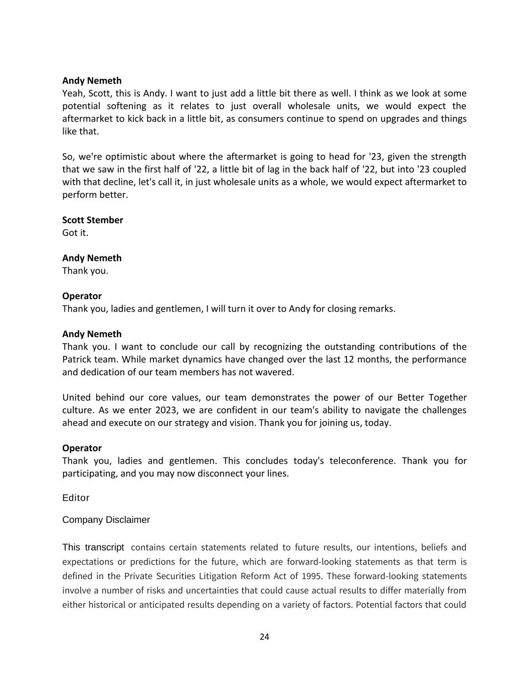 24 Andy Nemeth Yeah, Scott, this is Andy. I want to just add a little bit there as well. I think as we look at some potential softening as it relates to just overall wholesale units, we would expect the aftermarket to kick back in a little bit, as consumers continue to spend on upgrades and things like that. So, we're optimistic about where the aftermarket is going to head for '23, given the strength that we saw in the first half of '22, a little bit of lag in the back half of '22, but into '23 coupled with that decline, let's call it, in just wholesale units as a whole, we would expect aftermarket to perform better. Scott Stember Got it. Andy Nemeth Thank you. Operator Thank you, ladies and gentlemen, I will turn it over to Andy for closing remarks. Andy Nemeth Thank you. I want to conclude our call by recognizing the outstanding contributions of the Patrick team. While market dynamics have changed over the last 12 months, the performance and dedication of our team members has not wavered. United behind our core values, our team demonstrates the power of our Better Together culture. As we enter 2023, we are confident in our team's ability to navigate the challenges ahead and execute on our strategy and vision. Thank you for joining us, today. Operator Thank you, ladies and gentlemen. This concludes today's teleconference. Thank you for participating, and you may now disconnect your lines. Editor Company Disclaimer This transcript contains certain statements related to future results, our intentions, beliefs and expectations or predictions for the future, which are forward-looking statements as that term is defined in the Private Securities Litigation Reform Act of 1995. These forward-looking statements involve a number of risks and uncertainties that could cause actual results to differ materially from either historical or anticipated results depending on a variety of factors. Potential factors that could