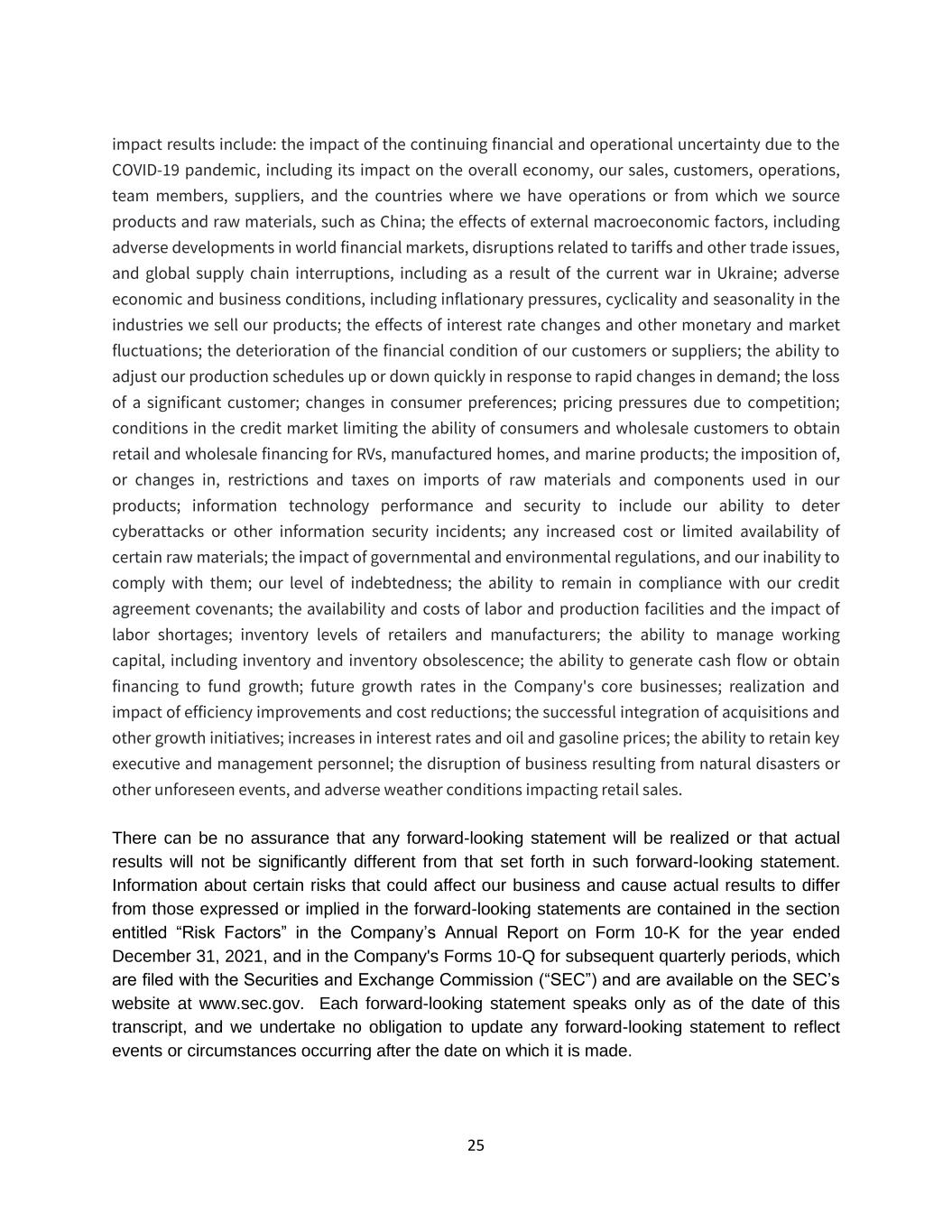 25 impact results include: the impact of the continuing financial and operational uncertainty due to the COVID-19 pandemic, including its impact on the overall economy, our sales, customers, operations, team members, suppliers, and the countries where we have operations or from which we source products and raw materials, such as China; the effects of external macroeconomic factors, including adverse developments in world financial markets, disruptions related to tariffs and other trade issues, and global supply chain interruptions, including as a result of the current war in Ukraine; adverse economic and business conditions, including inflationary pressures, cyclicality and seasonality in the industries we sell our products; the effects of interest rate changes and other monetary and market fluctuations; the deterioration of the financial condition of our customers or suppliers; the ability to adjust our production schedules up or down quickly in response to rapid changes in demand; the loss of a significant customer; changes in consumer preferences; pricing pressures due to competition; conditions in the credit market limiting the ability of consumers and wholesale customers to obtain retail and wholesale financing for RVs, manufactured homes, and marine products; the imposition of, or changes in, restrictions and taxes on imports of raw materials and components used in our products; information technology performance and security to include our ability to deter cyberattacks or other information security incidents; any increased cost or limited availability of certain raw materials; the impact of governmental and environmental regulations, and our inability to comply with them; our level of indebtedness; the ability to remain in compliance with our credit agreement covenants; the availability and costs of labor and production facilities and the impact of labor shortages; inventory levels of retailers and manufacturers; the ability to manage working capital, including inventory and inventory obsolescence; the ability to generate cash flow or obtain financing to fund growth; future growth rates in the Company's core businesses; realization and impact of efficiency improvements and cost reductions; the successful integration of acquisitions and other growth initiatives; increases in interest rates and oil and gasoline prices; the ability to retain key executive and management personnel; the disruption of business resulting from natural disasters or other unforeseen events, and adverse weather conditions impacting retail sales. There can be no assurance that any forward-looking statement will be realized or that actual results will not be significantly different from that set forth in such forward-looking statement. Information about certain risks that could affect our business and cause actual results to differ from those expressed or implied in the forward-looking statements are contained in the section entitled “Risk Factors” in the Company’s Annual Report on Form 10-K for the year ended December 31, 2021, and in the Company's Forms 10-Q for subsequent quarterly periods, which are filed with the Securities and Exchange Commission (“SEC”) and are available on the SEC’s website at www.sec.gov. Each forward-looking statement speaks only as of the date of this transcript, and we undertake no obligation to update any forward-looking statement to reflect events or circumstances occurring after the date on which it is made.