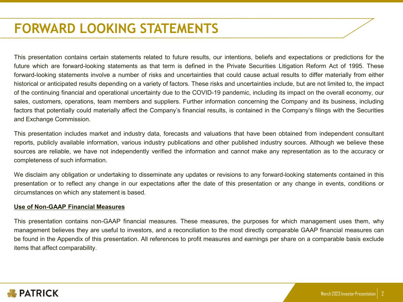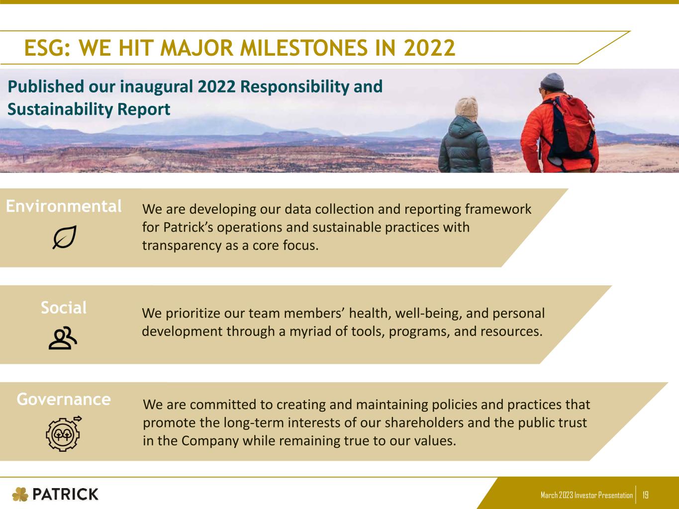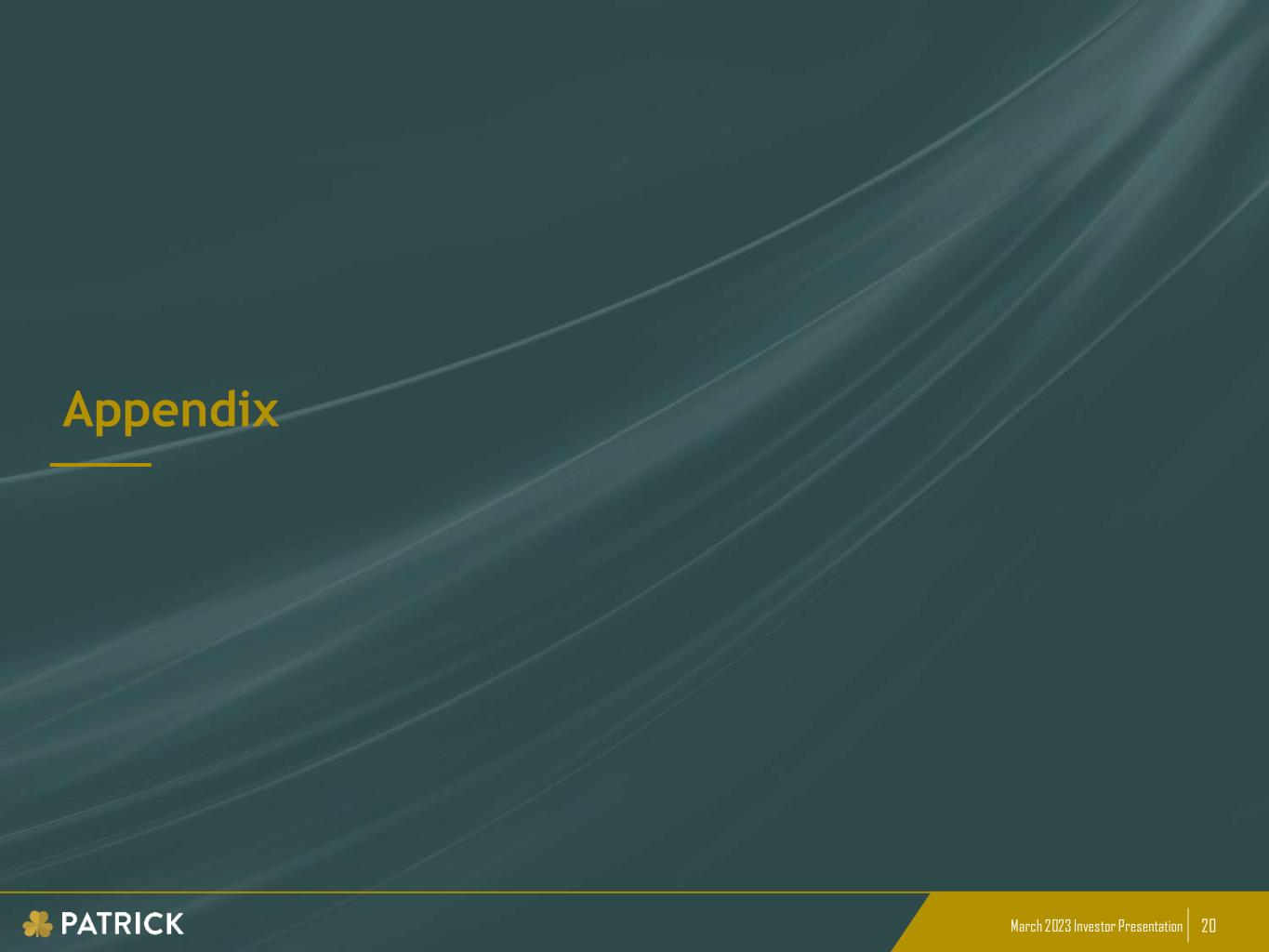 March 2023 Investor Presentation 19 ESG: WE HIT MAJOR MILESTONES IN 2022 Published our inaugural 2022 Responsibility and Sustainability Report Governance Environmental Social We are developing our data collection and reporting framework for Patrick’s operations and sustainable practices with transparency as a core focus. We prioritize our team members’ health, well-being, and personal development through a myriad of tools, programs, and resources. We are committed to creating and maintaining policies and practices that promote the long-term interests of our shareholders and the public trust in the Company while remaining true to our values.