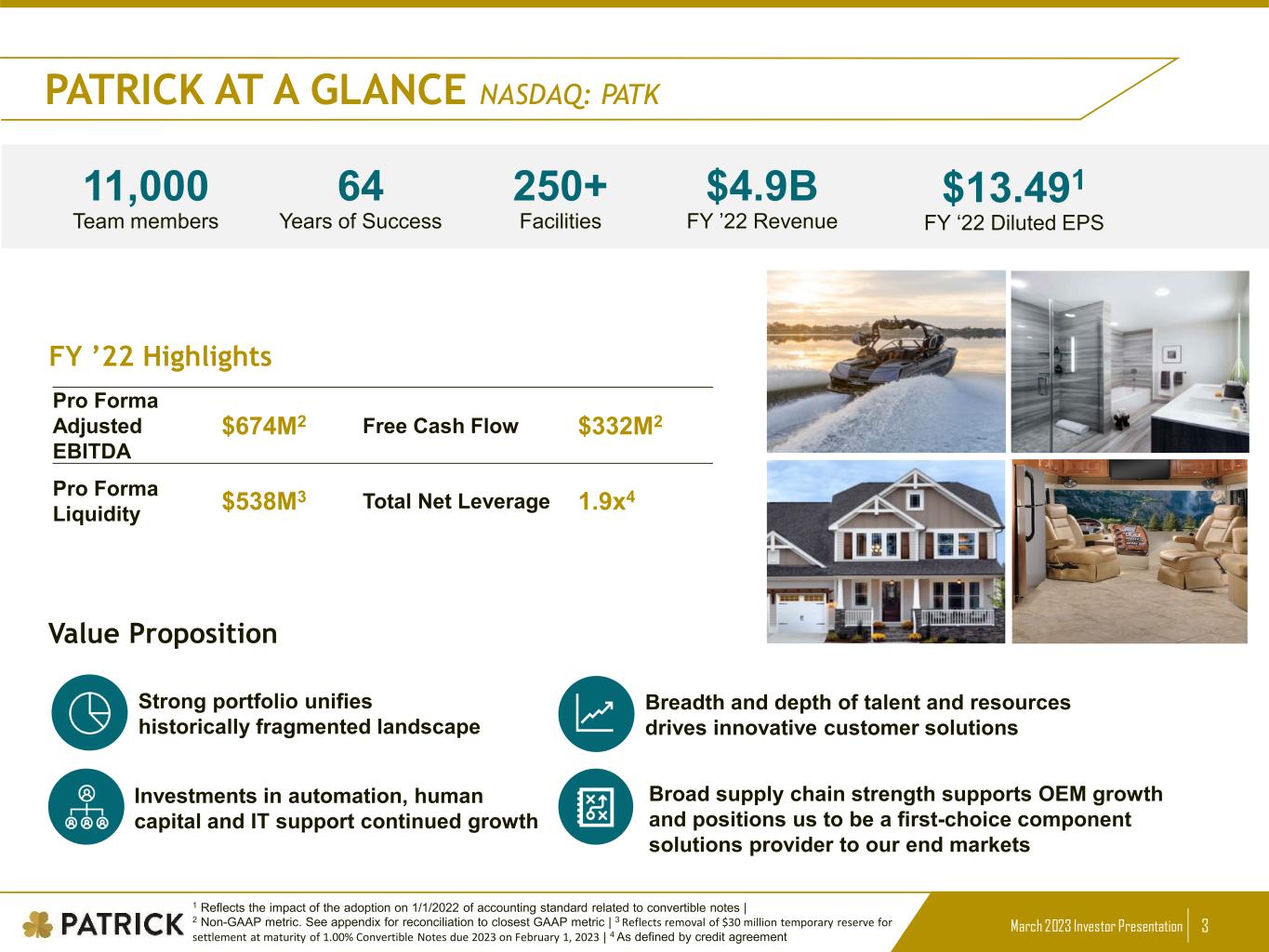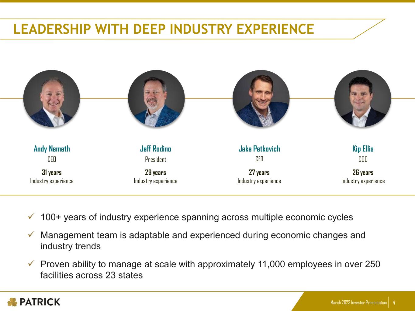 March 2023 Investor Presentation 3 FY ’22 Highlights Team members 11,000 Years of Success 64 Facilities 250+ FY ’22 Revenue $4.9B Pro Forma Adjusted EBITDA $674M2 Free Cash Flow $332M2 Pro Forma Liquidity $538M3 Total Net Leverage 1.9x4 Strong portfolio unifies historically fragmented landscape Investments in automation, human capital and IT support continued growth Breadth and depth of talent and resources drives innovative customer solutions Broad supply chain strength supports OEM growth and positions us to be a first-choice component solutions provider to our end markets Value Proposition PATRICK AT A GLANCE NASDAQ: PATK 1 Reflects the impact of the adoption on 1/1/2022 of accounting standard related to convertible notes | 2 Non-GAAP metric. See appendix for reconciliation to closest GAAP metric | 3 Reflects removal of $30 million temporary reserve for settlement at maturity of 1.00% Convertible Notes due 2023 on February 1, 2023 | 4 As defined by credit agreement FY ‘22 Diluted EPS $13.491