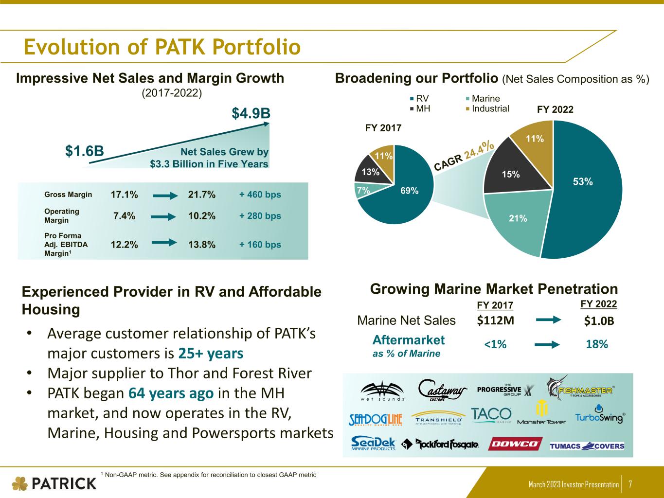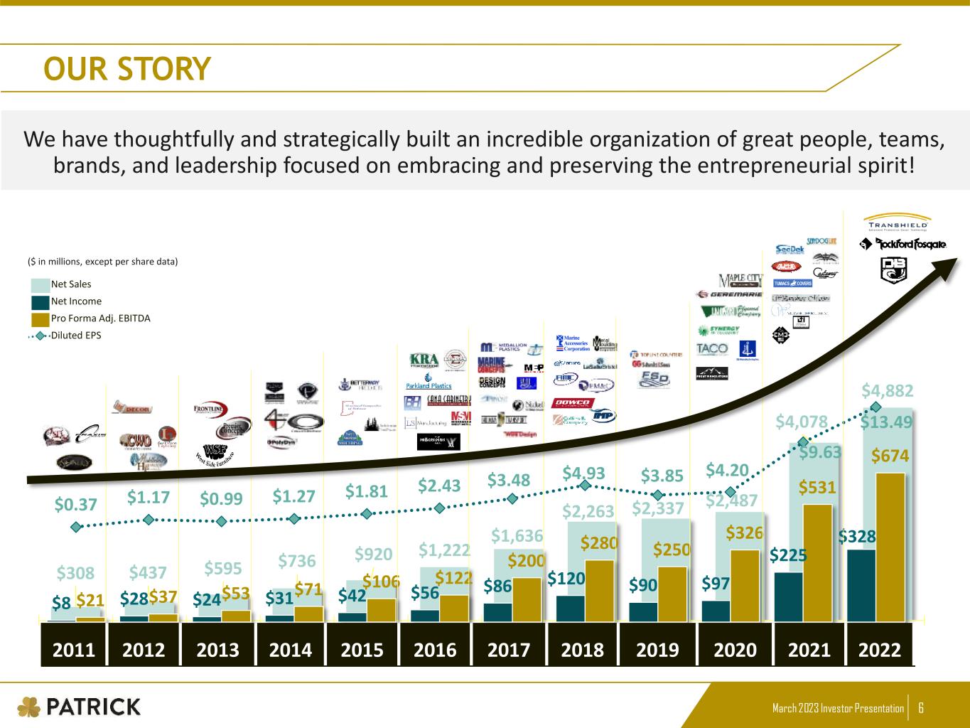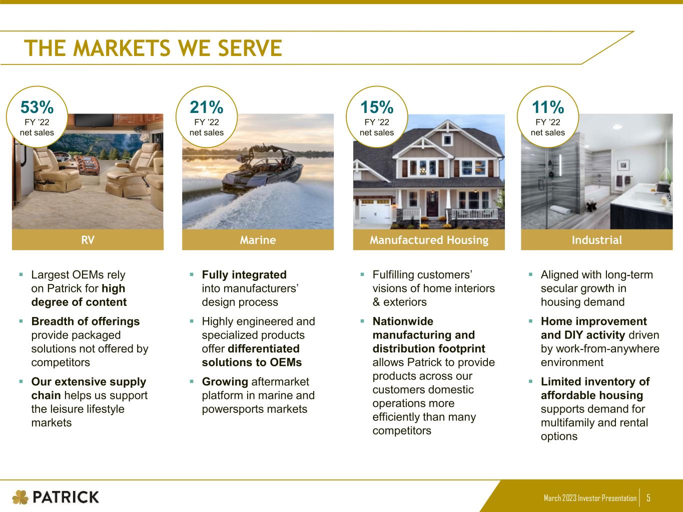 March 2023 Investor Presentation 5  Fulfilling customers’ visions of home interiors & exteriors  Nationwide manufacturing and distribution footprint allows Patrick to provide products across our customers domestic operations more efficiently than many competitors  Aligned with long-term secular growth in housing demand  Home improvement and DIY activity driven by work-from-anywhere environment  Limited inventory of affordable housing supports demand for multifamily and rental options  Largest OEMs rely on Patrick for high degree of content  Breadth of offerings provide packaged solutions not offered by competitors  Our extensive supply chain helps us support the leisure lifestyle markets  Fully integrated into manufacturers’ design process  Highly engineered and specialized products offer differentiated solutions to OEMs  Growing aftermarket platform in marine and powersports markets 53% FY ’22 net sales RV Marine 21% FY ’22 net sales Manufactured Housing 15% FY ’22 net sales Industrial 11% FY ’22 net sales THE MARKETS WE SERVE