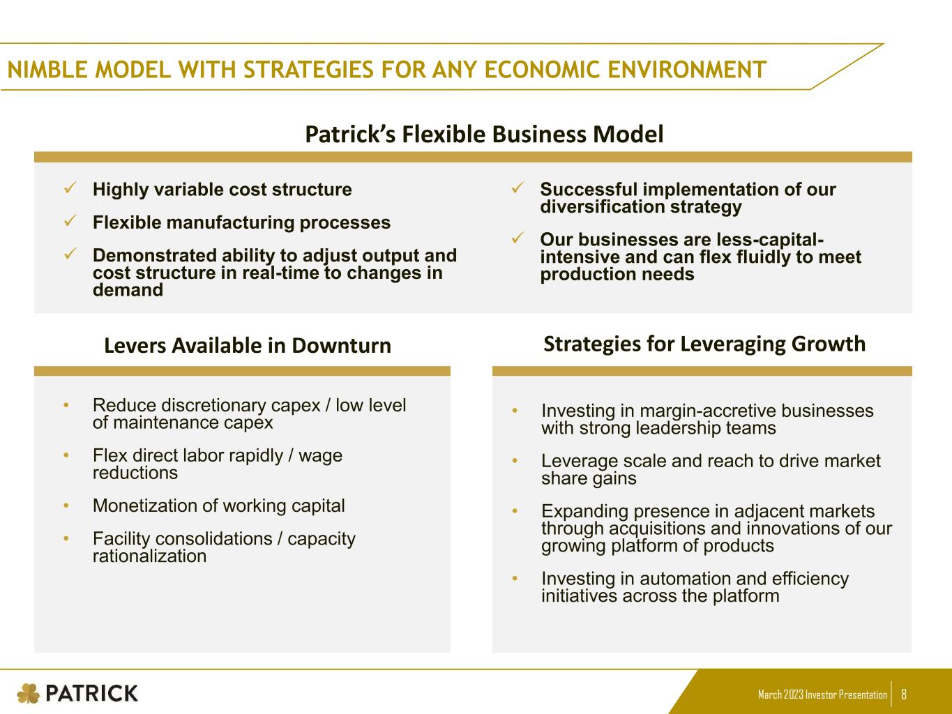 March 2023 Investor Presentation 8 NIMBLE MODEL WITH STRATEGIES FOR ANY ECONOMIC ENVIRONMENT Patrick’s Flexible Business Model  Highly variable cost structure  Flexible manufacturing processes  Demonstrated ability to adjust output and cost structure in real-time to changes in demand  Successful implementation of our diversification strategy  Our businesses are less-capital- intensive and can flex fluidly to meet production needs • Reduce discretionary capex / low level of maintenance capex • Flex direct labor rapidly / wage reductions • Monetization of working capital • Facility consolidations / capacity rationalization Levers Available in Downturn Strategies for Leveraging Growth • Investing in margin-accretive businesses with strong leadership teams • Leverage scale and reach to drive market share gains • Expanding presence in adjacent markets through acquisitions and innovations of our growing platform of products • Investing in automation and efficiency initiatives across the platform