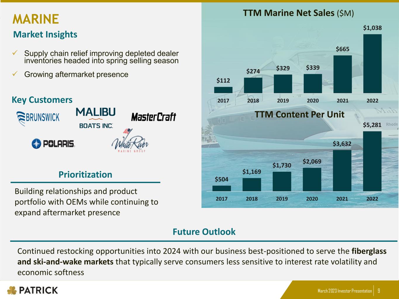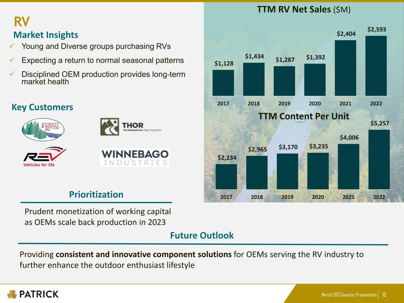 March 2023 Investor Presentation 9 MARINE TTM Marine Net Sales ($M) TTM Content Per Unit MARINE arket Insights  Supply chain relief improving depleted dealer inventories headed into spring selling season  Growing aftermarket presence Key Customers Prioritization Building relationships and product portfolio with OEMs while continuing to expand aftermarket presence $112 $274 $329 $339 $665 $1,038 2017 2018 2019 2020 2021 2022 $504 $1,169 $1,730 $2,069 $3,632 $5,281 2017 2018 2019 2020 2021 2022 Future Outlook Continued restocking opportunities into 2024 with our business best-positioned to serve the fiberglass and ski-and-wake markets that typically serve consumers less sensitive to interest rate volatility and economic softness