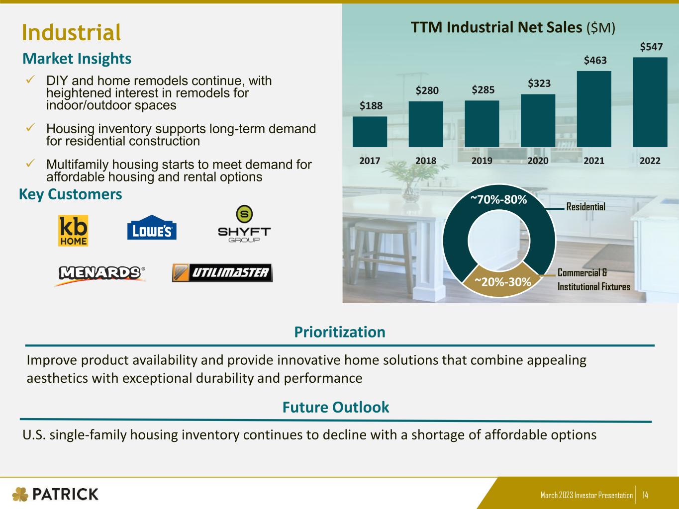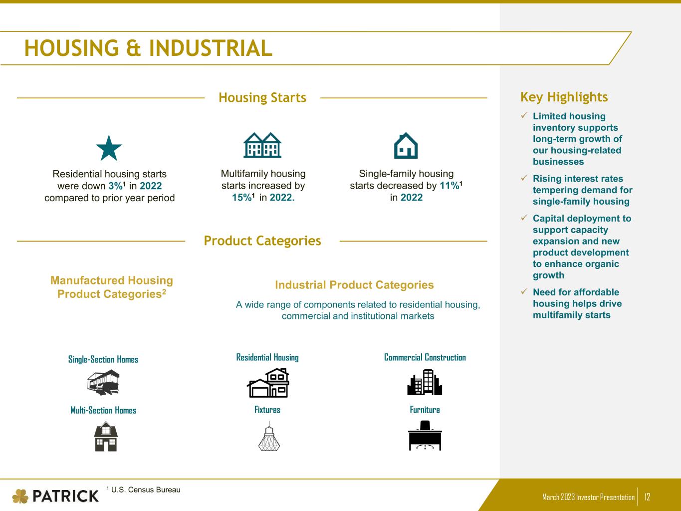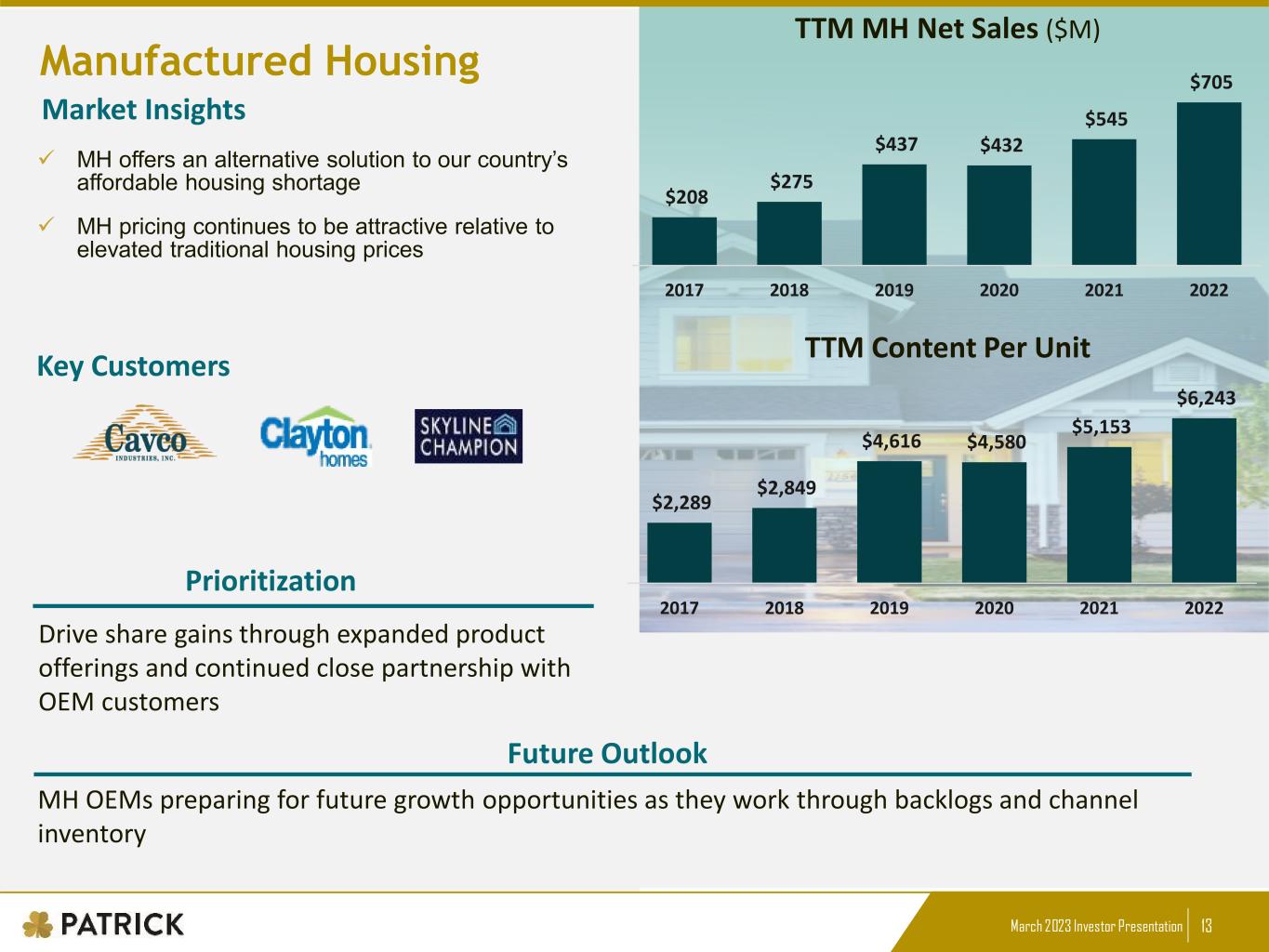 March 2023 Investor Presentation 12 Key Highlights  Limited housing inventory supports long-term growth of our housing-related businesses  Rising interest rates tempering demand for single-family housing  Capital deployment to support capacity expansion and new product development to enhance organic growth  Need for affordable housing helps drive multifamily starts Residential Housing Commercial Construction Fixtures Furniture Single-Section Homes Multi-Section Homes Residential housing starts were down 3%1 in 2022 compared to prior year period Multifamily housing starts increased by 15%1 in 2022. Single-family housing starts decreased by 11%1 in 2022 Housing Starts Product Categories Manufactured Housing Product Categories2 Industrial Product Categories A wide range of components related to residential housing, commercial and institutional markets 1 U.S. Census Bureau HOUSING & INDUSTRIAL