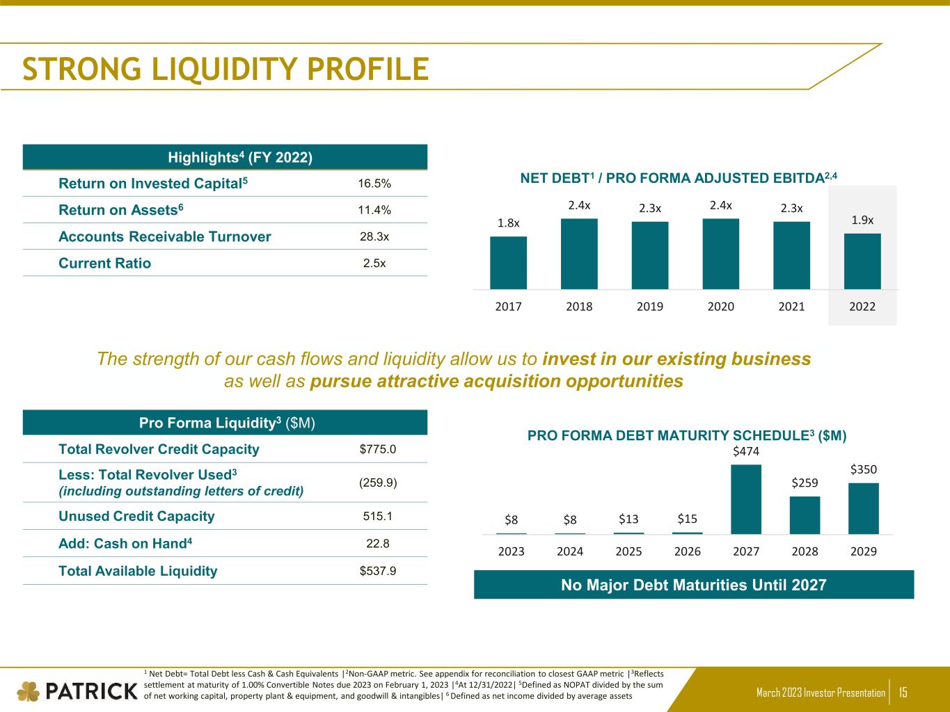 March 2023 Investor Presentation 14 MARINE Industrial arket Insights Key Customers Prioritization Future Outlook TTM Industrial Net Sales ($M)  DIY and home remodels continue, with heightened interest in remodels for indoor/outdoor spaces  Housing inventory supports long-term demand for residential construction  Multifamily housing starts to meet demand for affordable housing and rental options ~70%-80% ~20%-30% Commercial & Institutional Fixtures Residential $188 $280 $285 $323 $463 $547 2017 2018 2019 2020 2021 2022 U.S. single-family housing inventory continues to decline with a shortage of affordable options Improve product availability and provide innovative home solutions that combine appealing aesthetics with exceptional durability and performance