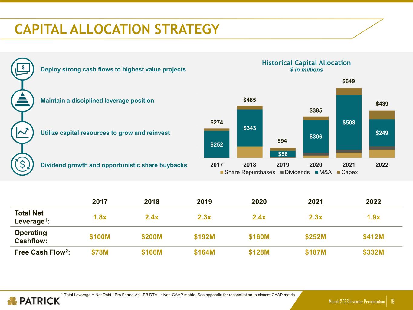 March 2023 Investor Presentation 16 Historical Capital Allocation $ in millionsDeploy strong cash flows to highest value projects Maintain a disciplined leverage position Utilize capital resources to grow and reinvest Dividend growth and opportunistic share buybacks $252 $343 $56 $306 $508 $249 $0 $100 $200 $300 $400 $500 $600 $700 2017 2018 2019 2020 2021 2022 Share Repurchases Dividends M&A Capex $274 $485 $94 $385 $649 Total $439 CAPITAL ALLOCATION STRATEGY 1 Total Leverage = Net Debt / Pro Forma Adj. EBIDTA | 2 Non-GAAP metric. See appendix for reconciliation to closest GAAP metric 2017 2018 2019 2020 2021 2022 Total Net Leverage1: 1.8x 2.4x 2.3x 2.4x 2.3x 1.9x Operating Cashflow: $100M $200M $192M $160M $252M $412M Free Cash Flow2: $78M $166M $164M $128M $187M $332M