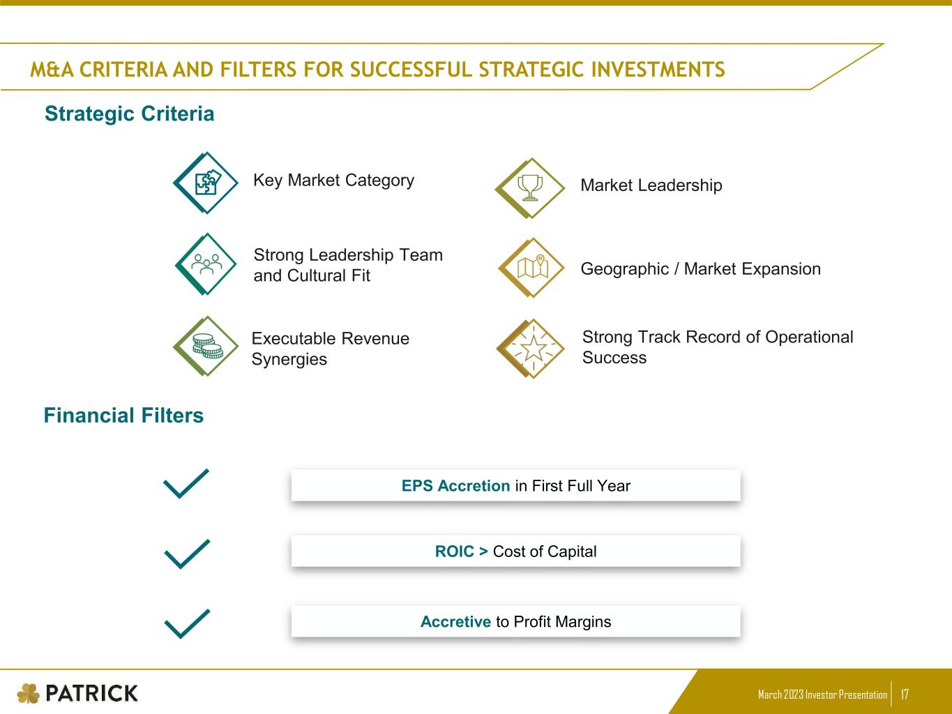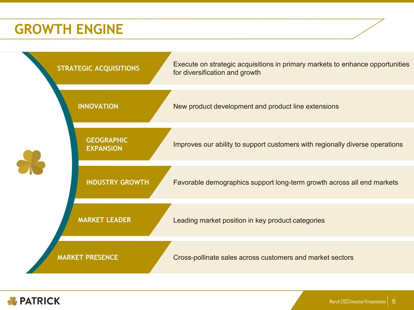 March 2023 Investor Presentation 17 Strong Leadership Team and Cultural Fit Executable Revenue Synergies Geographic / Market Expansion Market Leadership EPS Accretion in First Full Year ROIC > Cost of Capital Accretive to Profit Margins Strategic Criteria Key Market Category Financial Filters Strong Track Record of Operational Success M&A CRITERIA AND FILTERS FOR SUCCESSFUL STRATEGIC INVESTMENTS
