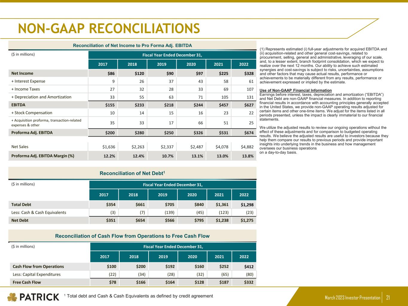 March 2023 Investor Presentation 21 NON-GAAP RECONCILIATIONS Reconciliation of Net Income to Pro Forma Adj. EBITDA Net Sales $1,636 $2,263 $2,337 $2,487 $4,078 $4,882 Proforma Adj. EBITDA Margin (%) 12.2% 12.4% 10.7% 13.1% 13.0% 13.8% Fiscal Year Ended December 31, 2017 2018 2019 2020 2021 2022 Net Income $86 $120 $90 $97 $225 $328 + Interest Expense 9 26 37 43 58 61 + Income Taxes 27 32 28 33 69 107 + Depreciation and Amortization 33 55 63 71 105 131 EBITDA $155 $233 $218 $244 $457 $627 + Stock Compensation 10 14 15 16 23 22 + Acquisition proforma, transaction-related expenses & other 35 33 17 66 51 25 Proforma Adj. EBITDA $200 $280 $250 $326 $531 $674 ($ in millions) (1) Represents estimated (i) full-year adjustments for acquired EBITDA and (ii) acquisition-related and other general cost-savings, related to procurement, selling, general and administrative, leveraging of our scale, and, to a lesser extent, branch footprint consolidation, which we expect to realize over the next 12 months. Our ability to achieve such estimated synergies and cost-savings is subject to risks, uncertainties, assumptions and other factors that may cause actual results, performance or achievements to be materially different from any results, performance or achievement expressed or implied by the estimate. Use of Non-GAAP Financial Information Earnings before interest, taxes, depreciation and amortization (“EBITDA”) and Net Debt are non-GAAP financial measures. In addition to reporting financial results in accordance with accounting principles generally accepted in the United States, we provide non-GAAP operating results adjusted for certain items and other one-time items. We adjust for the items listed in all periods presented, unless the impact is clearly immaterial to our financial statements. We utilize the adjusted results to review our ongoing operations without the effect of these adjustments and for comparison to budgeted operating results. We believe the adjusted results are useful to investors because they help them compare our results to previous periods and provide important insights into underlying trends in the business and how management oversees our business operations on a day-to-day basis. Fiscal Year Ended December 31, 2017 2018 2019 2020 2021 2022 Total Debt $354 $661 $705 $840 $1,361 $1,298 Less: Cash & Cash Equivalents (3) (7) (139) (45) (123) (23) Net Debt $351 $654 $566 $795 $1,238 $1,275 Reconciliation of Net Debt1 ($ in millions) 1 Total debt and Cash & Cash Equivalents as defined by credit agreement Reconciliation of Cash Flow from Operations to Free Cash Flow Fiscal Year Ended December 31, 2017 2018 2019 2020 2021 2022 Cash Flow from Operations $100 $200 $192 $160 $252 $412 Less: Capital Expenditures (22) (34) (28) (32) (65) (80) Free Cash Flow $78 $166 $164 $128 $187 $332 ($ in millions)