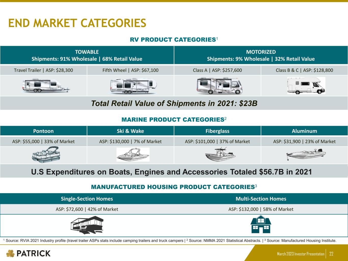 March 2023 Investor Presentation 22 END MARKET CATEGORIES Single-Section Homes Multi-Section Homes ASP: $72,600 | 42% of Market ASP: $132,000 | 58% of Market TOWABLE Shipments: 91% Wholesale | 68% Retail Value MOTORIZED Shipments: 9% Wholesale | 32% Retail Value Travel Trailer | ASP: $28,300 Fifth Wheel | ASP: $67,100 Class A | ASP: $257,600 Class B & C | ASP: $128,800 Total Retail Value of Shipments in 2021: $23B RV PRODUCT CATEGORIES1 Pontoon Ski & Wake Fiberglass Aluminum ASP: $55,000 | 33% of Market ASP: $130,000 | 7% of Market ASP: $101,000 | 37% of Market ASP: $31,900 | 23% of Market U.S Expenditures on Boats, Engines, and Accessories Totaled $xxB in 2019 MARINE PRODUCT CATEGORIES2 MANUFACTURED HOUSING PRODUCT CATEGORIES3 1 Source: RVIA 2021 Industry profile (travel trailer ASPs stats include camping trailers and truck campers | 2 Source: NMMA 2021 Statistical Abstracts. | 3 Source: Manufactured Housing Institute. U.S Expenditures on Boats, Engines and Accessories Totaled $56.7 21
