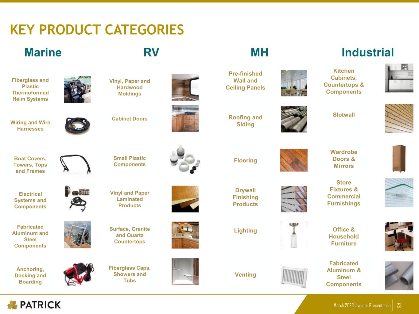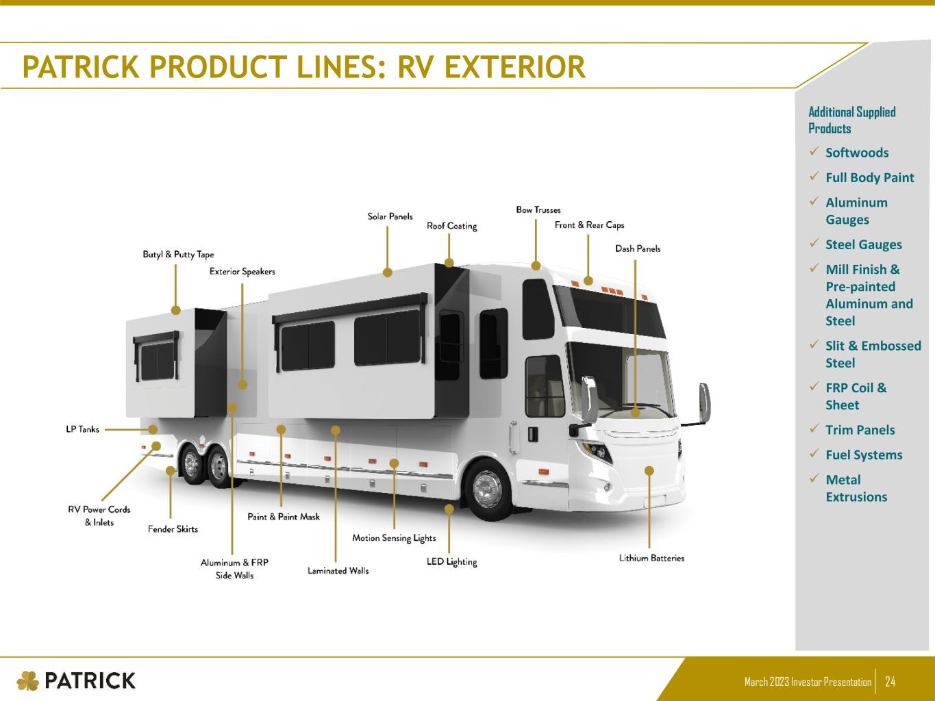 March 2023 Investor Presentation 23 KEY PRODUCT CATEGORIES Fiberglass and Plastic Thermoformed Helm Systems Wiring and Wire Harnesses Electrical Systems and Components Fabricated Aluminum and Steel Components Boat Covers, Towers, Tops and Frames Anchoring, Docking and Boarding Vinyl and Paper Laminated Products Surface, Granite and Quartz Countertops Vinyl, Paper and Hardwood Moldings Fiberglass Caps, Showers and Tubs Cabinet Doors Small Plastic Components Pre-finished Wall and Ceiling Panels Drywall Finishing Products Flooring Roofing and Siding Venting Lighting Kitchen Cabinets, Countertops & Components Office & Household Furniture Wardrobe Doors & Mirrors Store Fixtures & Commercial Furnishings Slotwall Fabricated Aluminum & Steel Components Marine RV MH Industrial