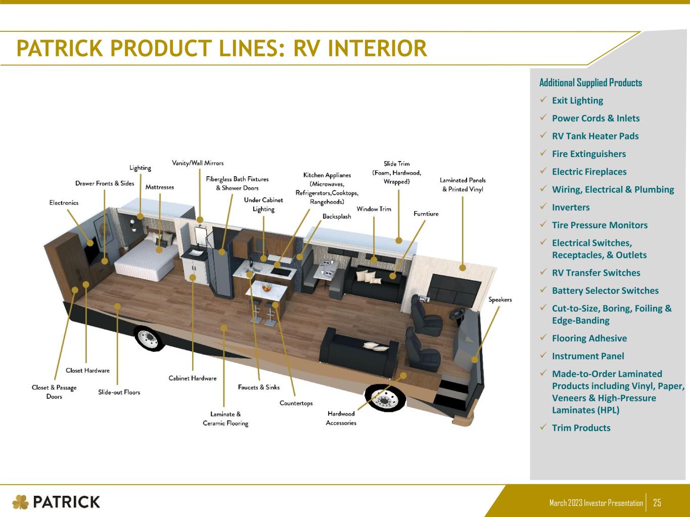 March 2023 Investor Presentation 24 PATRICK PRODUCT LINES: RV EXTERIOR Additional Supplied Products  Softwoods  Full Body Paint  Aluminum Gauges  Steel Gauges  Mill Finish & Pre-painted Aluminum and Steel  Slit & Embossed Steel  FRP Coil & Sheet  Trim Panels  Fuel Systems  Metal Extrusions