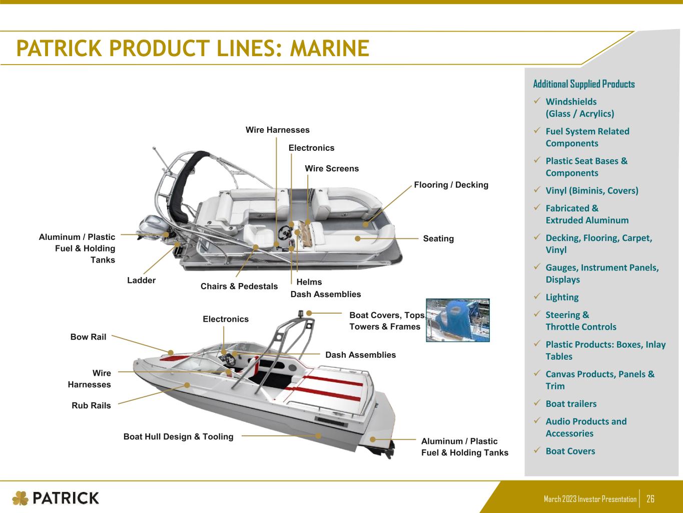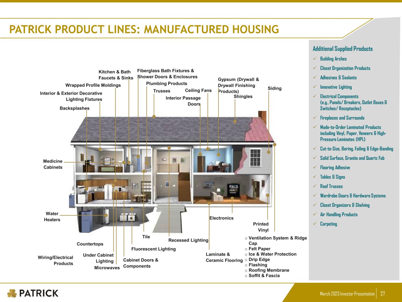 March 2023 Investor Presentation 26 PATRICK PRODUCT LINES: MARINE Additional Supplied Products  Softwoods  Full Body Paint  Aluminum Gauges  Steel Gauges  Mill Finish & Pre-painted Aluminum and Steel  Slit & Embossed Steel  FRP Coil & Sheet  Trim Panels  Fuel Systems  Metal Extrusions Aluminum / Plastic Fuel & Holding Tanks Wire Harnesses Electronics Dash Assemblies Wire Screens Helms Aluminum / Plastic Fuel & Holding Tanks Boat Hull Design & Tooling Wire Harnesses Dash Assemblies Electronics Boat Covers, Tops, Towers & Frames Ladder Chairs & Pedestals Rub Rails Bow Rail Flooring / Decking Seating Additional Supplied Products  Windshields (Glass / Acrylics)  Fuel System Related Components  Plastic Seat Bases & Components  Vinyl (Biminis, Covers)  Fabricated & Extruded Aluminum  Decking, Flooring, Carpet, Vinyl  Gauges, Instrument Panels, Displays  Lighting  Steering & Throttle Controls  Plastic Products: Boxes, Inlay Tables  Canvas Products, Panels & Trim  Boat trailers  Audio Products and Accessories  Boat Covers