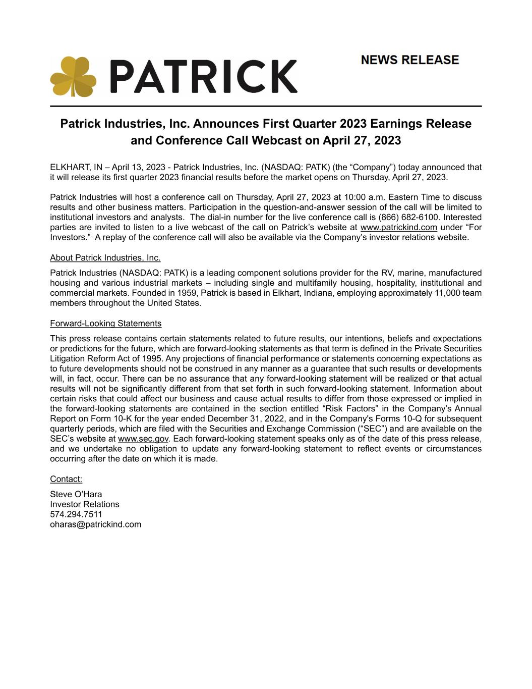 Patrick Industries, Inc. Announces First Quarter 2023 Earnings Release and Conference Call Webcast on April 27, 2023 ELKHART, IN – April 13, 2023 - Patrick Industries, Inc. (NASDAQ: PATK) (the “Company”) today announced that it will release its first quarter 2023 financial results before the market opens on Thursday, April 27, 2023. Patrick Industries will host a conference call on Thursday, April 27, 2023 at 10:00 a.m. Eastern Time to discuss results and other business matters. Participation in the question-and-answer session of the call will be limited to institutional investors and analysts. The dial-in number for the live conference call is (866) 682-6100. Interested parties are invited to listen to a live webcast of the call on Patrick’s website at www.patrickind.com under “For Investors.” A replay of the conference call will also be available via the Company’s investor relations website. About Patrick Industries, Inc. Patrick Industries (NASDAQ: PATK) is a leading component solutions provider for the RV, marine, manufactured housing and various industrial markets – including single and multifamily housing, hospitality, institutional and commercial markets. Founded in 1959, Patrick is based in Elkhart, Indiana, employing approximately 11,000 team members throughout the United States. Forward-Looking Statements This press release contains certain statements related to future results, our intentions, beliefs and expectations or predictions for the future, which are forward-looking statements as that term is defined in the Private Securities Litigation Reform Act of 1995. Any projections of financial performance or statements concerning expectations as to future developments should not be construed in any manner as a guarantee that such results or developments will, in fact, occur. There can be no assurance that any forward-looking statement will be realized or that actual results will not be significantly different from that set forth in such forward-looking statement. Information about certain risks that could affect our business and cause actual results to differ from those expressed or implied in the forward-looking statements are contained in the section entitled “Risk Factors” in the Company’s Annual Report on Form 10-K for the year ended December 31, 2022, and in the Company's Forms 10-Q for subsequent quarterly periods, which are filed with the Securities and Exchange Commission (“SEC”) and are available on the SEC’s website at www.sec.gov. Each forward-looking statement speaks only as of the date of this press release, and we undertake no obligation to update any forward-looking statement to reflect events or circumstances occurring after the date on which it is made. Contact: Steve O’Hara Investor Relations 574.294.7511 oharas@patrickind.com
