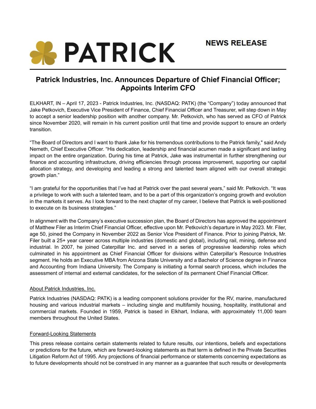Patrick Industries, Inc. Announces Departure of Chief Financial Officer; Appoints Interim CFO ELKHART, IN – April 17, 2023 - Patrick Industries, Inc. (NASDAQ: PATK) (the “Company”) today announced that Jake Petkovich, Executive Vice President of Finance, Chief Financial Officer and Treasurer, will step down in May to accept a senior leadership position with another company. Mr. Petkovich, who has served as CFO of Patrick since November 2020, will remain in his current position until that time and provide support to ensure an orderly transition. “The Board of Directors and I want to thank Jake for his tremendous contributions to the Patrick family," said Andy Nemeth, Chief Executive Officer. “His dedication, leadership and financial acumen made a significant and lasting impact on the entire organization. During his time at Patrick, Jake was instrumental in further strengthening our finance and accounting infrastructure, driving efficiencies through process improvement, supporting our capital allocation strategy, and developing and leading a strong and talented team aligned with our overall strategic growth plan.” “I am grateful for the opportunities that I’ve had at Patrick over the past several years,” said Mr. Petkovich. “It was a privilege to work with such a talented team, and to be a part of this organization’s ongoing growth and evolution in the markets it serves. As I look forward to the next chapter of my career, I believe that Patrick is well-positioned to execute on its business strategies.” In alignment with the Company’s executive succession plan, the Board of Directors has approved the appointment of Matthew Filer as Interim Chief Financial Officer, effective upon Mr. Petkovich’s departure in May 2023. Mr. Filer, age 50, joined the Company in November 2022 as Senior Vice President of Finance. Prior to joining Patrick, Mr. Filer built a 25+ year career across multiple industries (domestic and global), including rail, mining, defense and industrial. In 2007, he joined Caterpillar Inc. and served in a series of progressive leadership roles which culminated in his appointment as Chief Financial Officer for divisions within Caterpillar’s Resource Industries segment. He holds an Executive MBA from Arizona State University and a Bachelor of Science degree in Finance and Accounting from Indiana University. The Company is initiating a formal search process, which includes the assessment of internal and external candidates, for the selection of its permanent Chief Financial Officer. About Patrick Industries, Inc. Patrick Industries (NASDAQ: PATK) is a leading component solutions provider for the RV, marine, manufactured housing and various industrial markets – including single and multifamily housing, hospitality, institutional and commercial markets. Founded in 1959, Patrick is based in Elkhart, Indiana, with approximately 11,000 team members throughout the United States. Forward-Looking Statements This press release contains certain statements related to future results, our intentions, beliefs and expectations or predictions for the future, which are forward-looking statements as that term is defined in the Private Securities Litigation Reform Act of 1995. Any projections of financial performance or statements concerning expectations as to future developments should not be construed in any manner as a guarantee that such results or developments