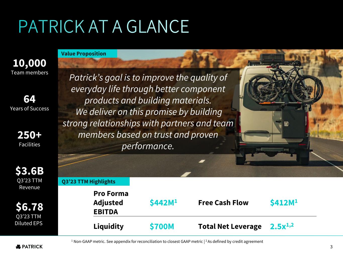 3 Team members 10,000 Years of Success 64 Facilities 250+ Q3’23 TTM Revenue $3.6B Q3’23 TTM Diluted EPS $6.78 Pro Forma Adjusted EBITDA $442M1 Free Cash Flow $412M1 Liquidity $700M Total Net Leverage 2.5x1,2 1 Non-GAAP metric. See appendix for reconciliation to closest GAAP metric | 2 As defined by credit agreement Q3’23 TTM Highlights Value Proposition Patrick’s goal is to improve the quality of everyday life through better component products and building materials. We deliver on this promise by building strong relationships with partners and team members based on trust and proven performance. 3