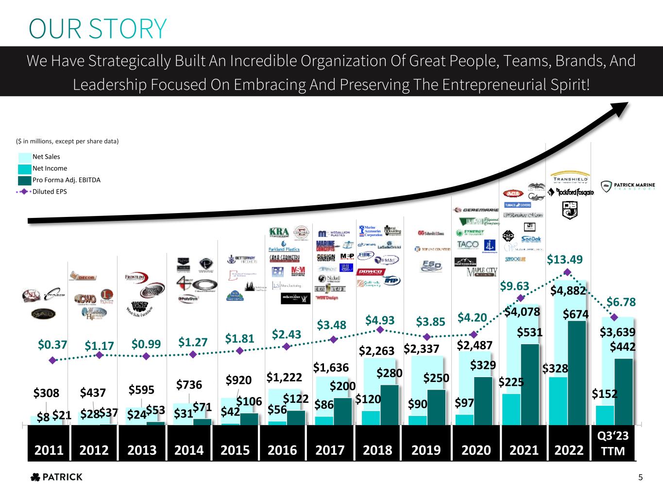 $308 $437 $595 $736 $920 $1,222 $1,636 $2,263 $2,337 $2,487 $4,078 $4,882 $3,639 2011 2012 2013 2014 2015 2016 2017 2018 2019 2020 2021 2022 Q1 23 TTm $8 $28 $24 $31 $42 $56 $86 $120 $90 $97 $225 $328 $152 $21 $37 $53 $71 $106 $122 $200 $280 $250 $329 $531 $674 $442 $0.37 $1.17 $0.99 $1.27 $1.81 $2.43 $3.48 $4.93 $3.85 $4.20 $9.63 $13.49 $6.78 2011 2012 2013 2014 2015 2016 2017 2018 2019 2020 2021 2022 Q1 2023 TTM Net Sales Net Income Pro Forma Adj. EBITDA Diluted EPS We Have Strategically Built An Incredible Organization Of Great People, Teams, Brands, And Leadership Focused On Embracing And Preserving The Entrepreneurial Spirit! ($ in millions, except per share data) 2011 2012 2013 2014 2015 2016 2017 2018 2019 2020 2021 2022 Q3‘23 TTM 5