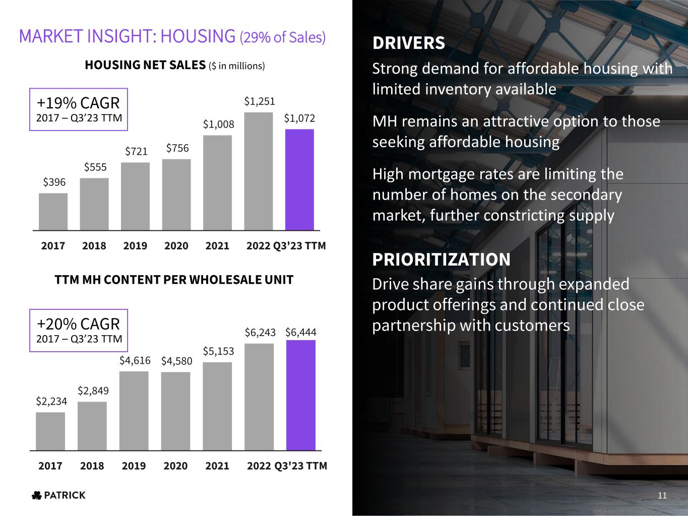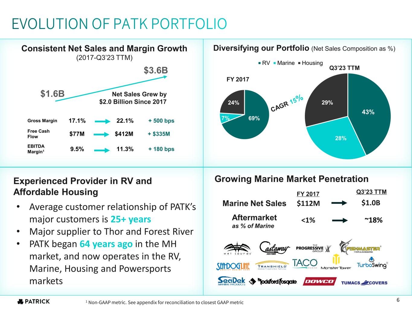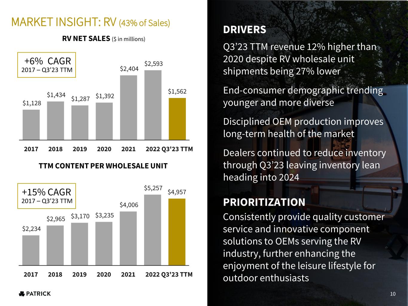 Q3’23 TTM revenue 12% higher than 2020 despite RV wholesale unit shipments being 27% lower End-consumer demographic trending younger and more diverse Disciplined OEM production improves long-term health of the market Dealers continued to reduce inventory through Q3’23 leaving inventory lean heading into 2024 $1,128 $1,434 $1,287 $1,392 $2,404 $2,593 $1,562 2017 2018 2019 2020 2021 2022 Q3'23 TTM $2,234 $2,965 $3,170 $3,235 $4,006 $5,257 $4,957 2017 2018 2019 2020 2021 2022 Q3'23 TTM PRIORITIZATION Consistently provide quality customer service and innovative component solutions to OEMs serving the RV industry, further enhancing the enjoyment of the leisure lifestyle for outdoor enthusiasts MARKET INSIGHT: RV (43% of Sales) DRIVERS RV NET SALES ($ in millions) TTM CONTENT PER WHOLESALE UNIT +6% CAGR 2017 – Q3’23 TTM +15% CAGR 2017 – Q3’23 TTM 10